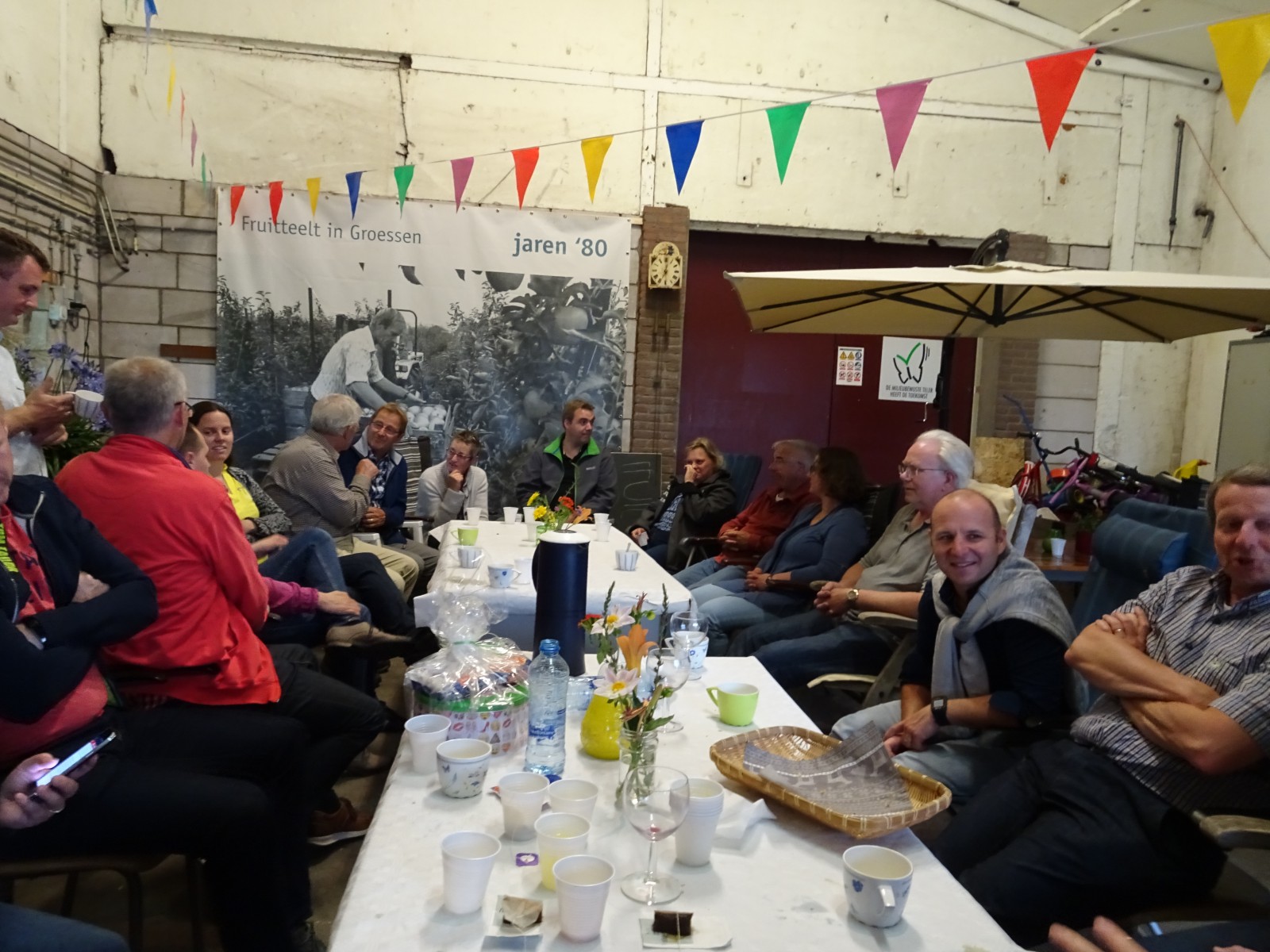 Het is dan wel prettig als het weer meewerkt. En hoewel het de afgelopen weken vaak erg zonnig en warm is geweest, begon het uitgerekend deze dag te miezeren. Gelukkig beschikt de locatie behalve over een tuin, ook over een grote schuur. Binnen no time werd deze ingericht als een overdekte camping. Met een partytent over de gril buiten kon het evenement toch losbarsten. De jeugdige leden zagen zelfs nog kans om een shuttletje te slaan, zoals dat hoort op een camping: weer of geen weer.