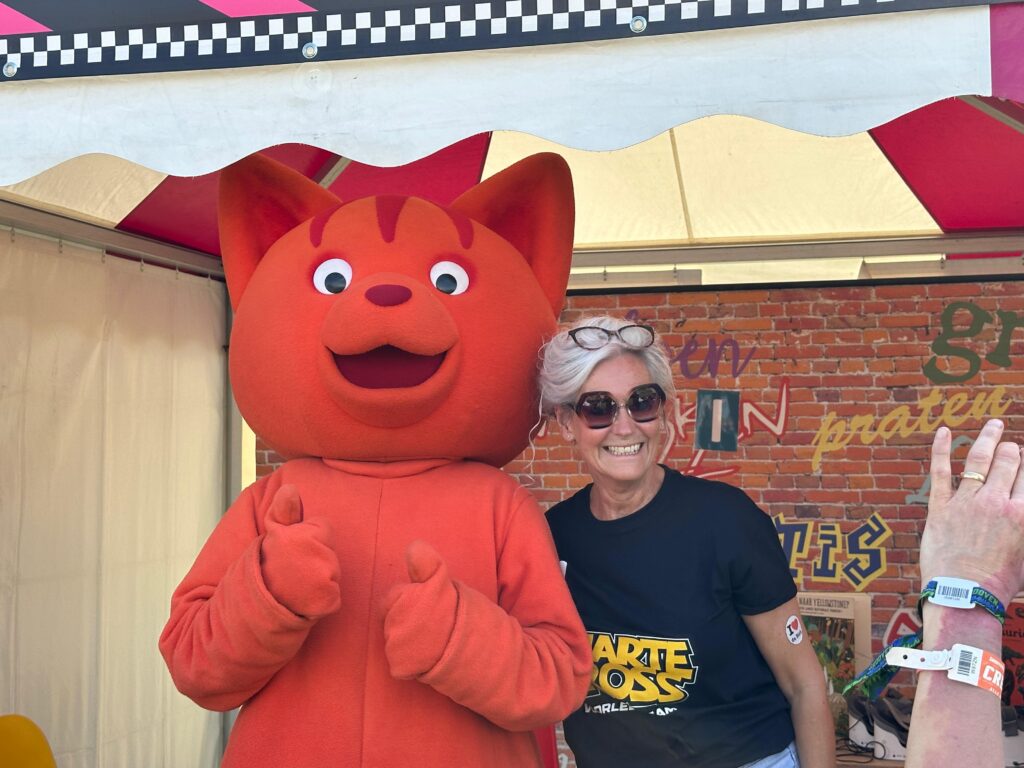 Sinds 2011 is de bibliotheek te vinden op de zwarte cross. Op het blagenparadijs van het festival was ook dit jaar Tante Rikies voorleesteam weer aanwezig. Dat team bestaat uit medewerkers van de samenwerkende Achterhoekse Bibliotheken. Op zaterdag lazen vanuit Bibliotheek Montferland ook beide BoekStartcoaches voor. Op de foto staat BoekStartcoach Karin Lieven met de eregast van dit jaar: Dikkie Dik.
