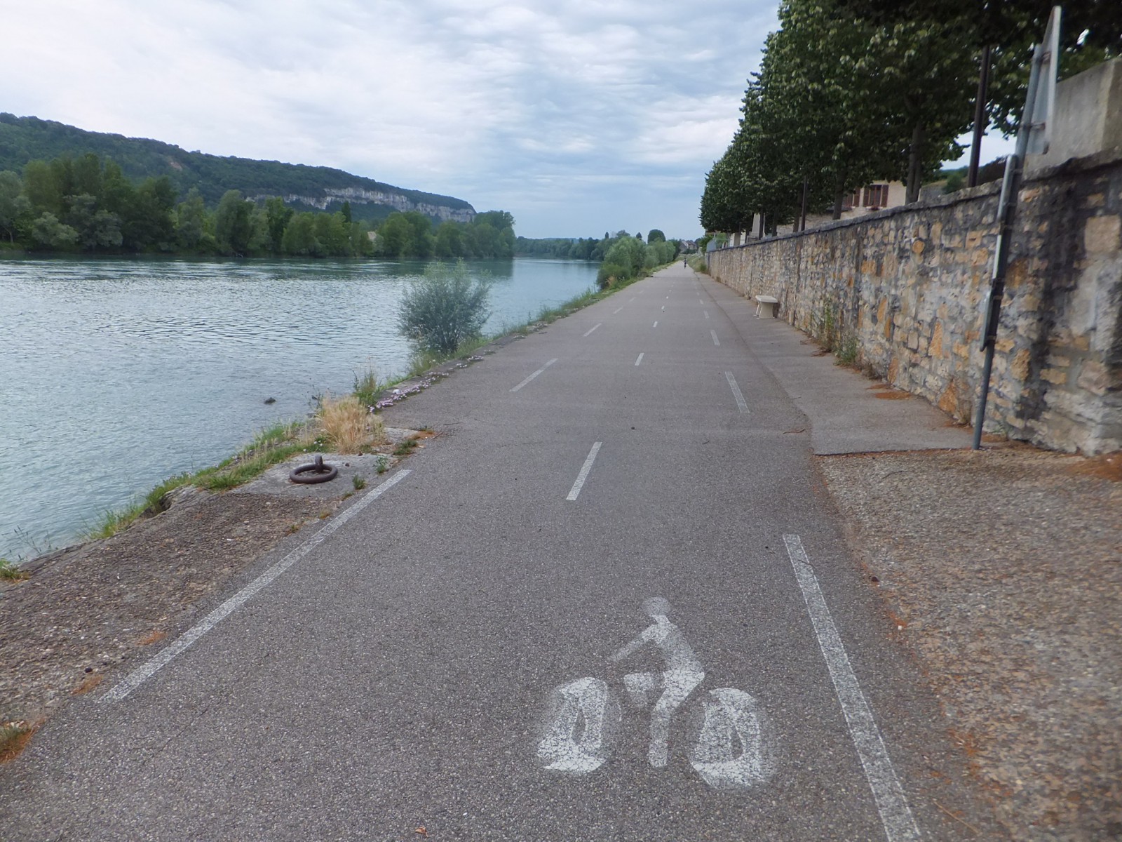 Ondanks dat het een hoofdweg is, is niet echt druk. Het is een glooiend landschap en ik ga nu richting Rhône dal. Rond de middag ben ik in Morestel. Ik had een andere toeristische route naar de Rhone willen rijden, maar de D1075 naar Bourg en Bresse loopt ook naar de Rhone. Ik besluit die weg te volgen. Bij Sault-Brenaz passeer ik de Rhône. De Rhône loopt naar de Middellandse Zee in het zuiden. Meer naar het noorden is de Saome , Moesel en de Maas de monden in De Atlantische oceaan of Noordzee via de Rijn. Ik moet dus nog naar een ander dal. Vanaf Sault-Brenaz loopt en mooi fietspad langs de Rhone.