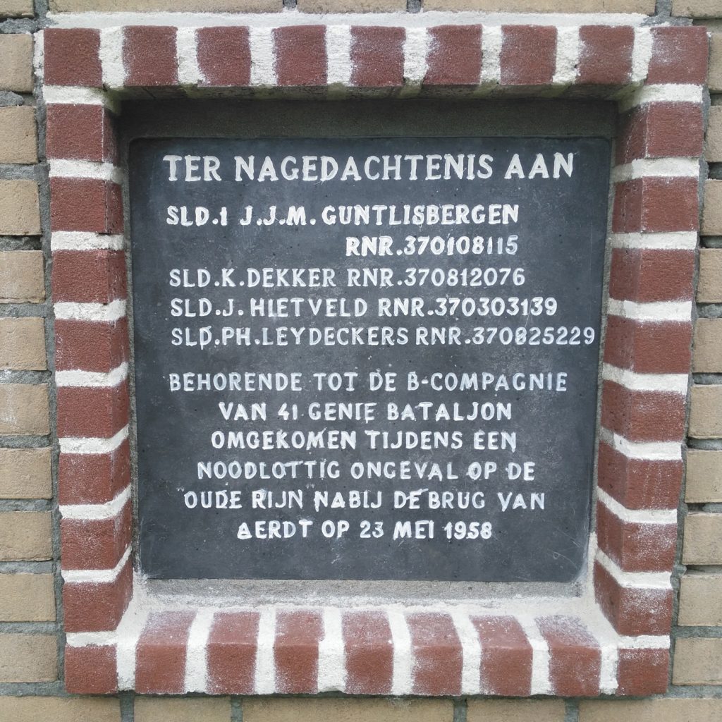 Het fietspad was slechts een houten plank aan de buitenkant van de brug. De meeste mensen durfden er niet overheen te fietsen en schuifelden lopend met de fiets aan de hand over de brug. Het geduld van de bewoners van het Gelders Eiland werd op de proef gesteld. Pas in 1958 verwijderde het leger de Baileybruggen en kwam er een nieuwe brug. Dat ging niet zonder slag of stoot. Op 23 mei gebeurde er een vreselijk ongeluk. Vier jonge dienstplichtige militairen verdronken toen de boot, waarmee ze over de Oude Rijn werden gezet, zonk. Op het grasveld achter Huis Aerdt staat nog steeds een monument dat aan dit drama herinnert.