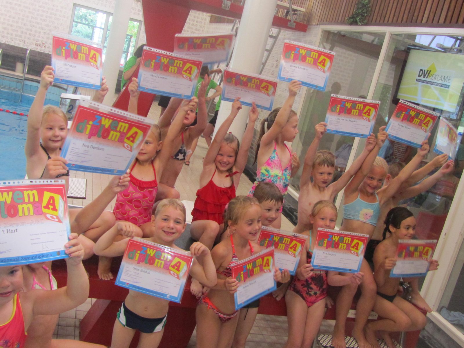 Veel ouders en belangstellenden verzamelden zich in het warme Lentebad om naar het diplomazwemmen van hun kinderen te komen kijken. Al enkele jaren zwemmen wij tegelijk voor alle diploma’s af. Dit wordt erg gewaardeerd door de ouders. Zij zien niet alleen hun eigen kind zwemmen, maar ook de kinderen voor het volgende diploma. Zij laten zien wat volgend jaar allemaal bijgeleerd moet worden. Omdat we met 29 tegelijkertijd afzwemmen is de tribune vol en is het erg gezellig in het zwembad. Dit motiveert om nog mooier te gaan zwemmen.