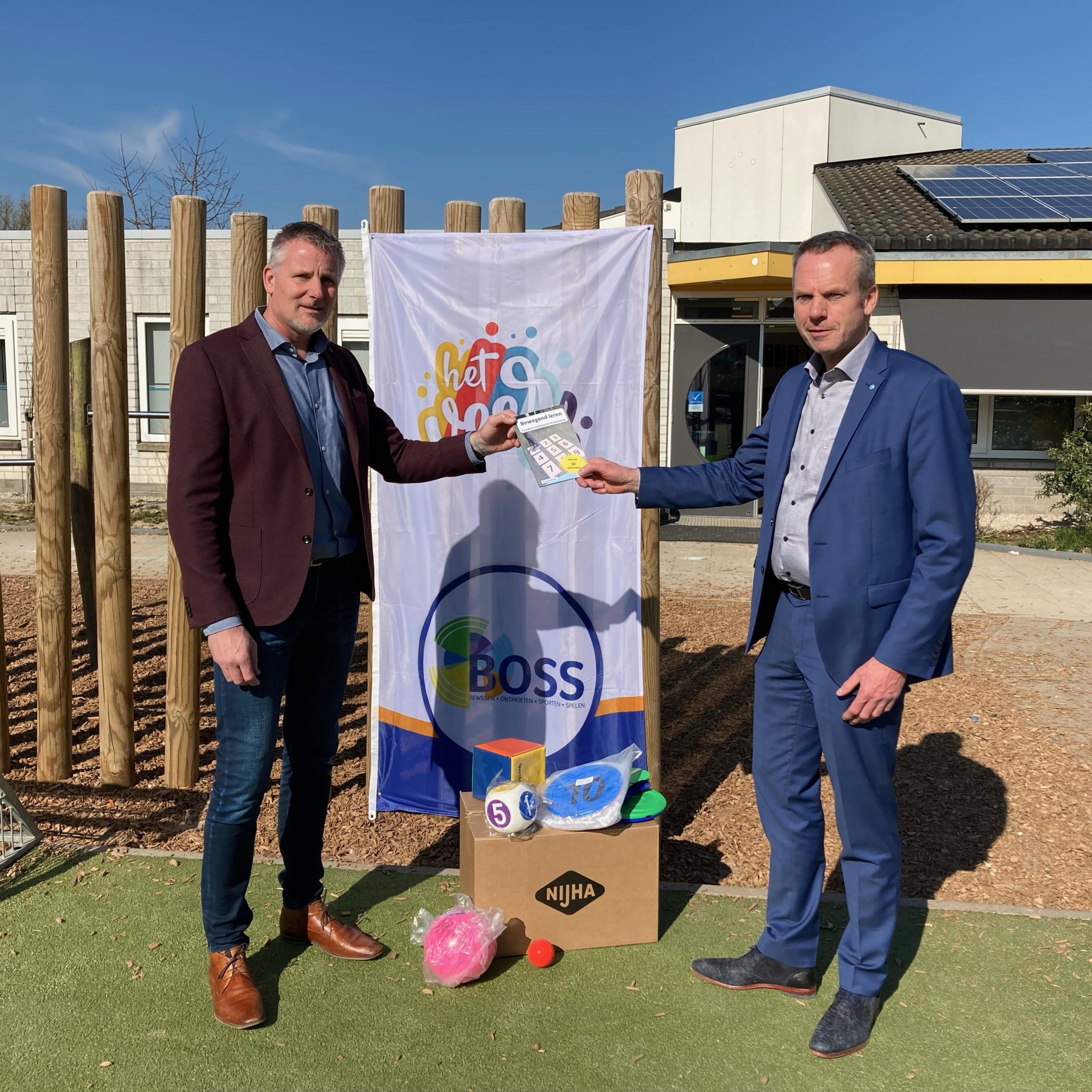 Donderdag 10 maart overhandigde wethouder Johannes Goossen een Bewegend leren spelpakket aan Gerard Smidts, directeur van basisschool IKC Het Veer. Bewegend leren kan op alle bassischolen in Duiven worden geïntroduceerd dankzij een subsidie vanuit het BOSS-akkoord. Met behulp van de financiële bijdragen kunnen coördinatoren worden opgeleid en ontvangen alle basisscholen een spelpakket met materialen.