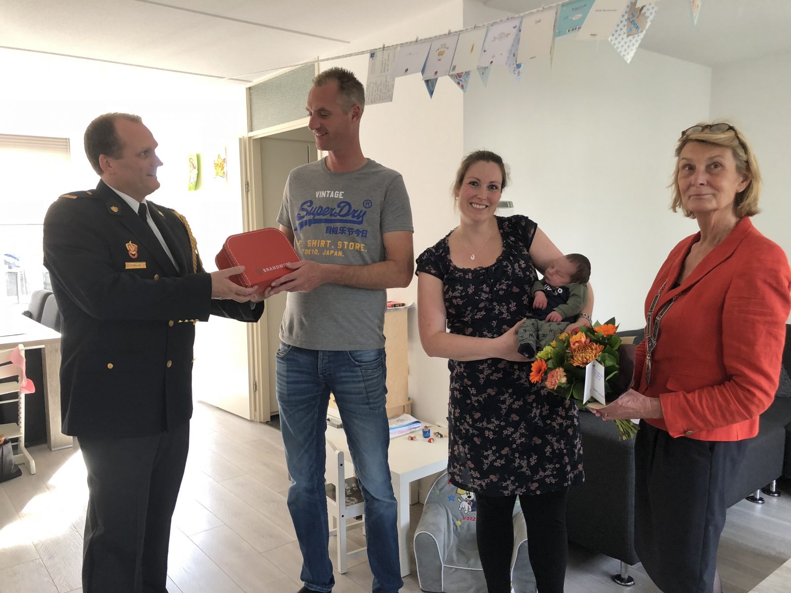Baby Hugo Grootoonk uit Zevenaar ontving op donderdag 11 oktober van burgemeester Ella Schadd-de Boer en Jeroen Beskers van de brandweer Zevenaar een geboortekoffertje vol met brandpreventietips en producten. Het bezoek van burgemeester en brandweer aan moeder Ilona Maertzdorff en vader Casperd Grootoonk maakt onderdeel uit van de brandpreventieweken.