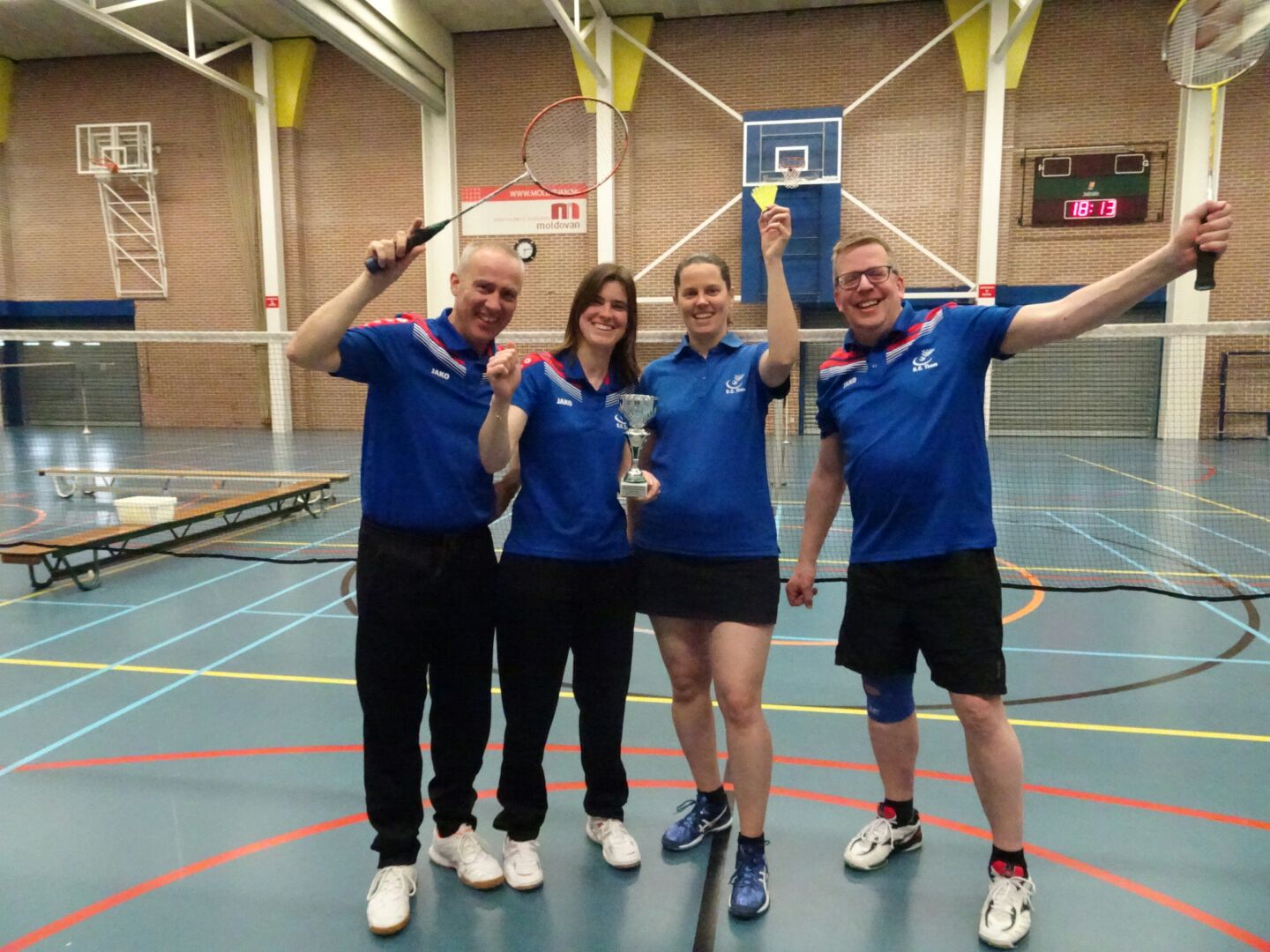 Dit seizoen heeft het zesde team van Badminton Club Thuve te Duiven het kampioenschap behaald, in de 5de klasse afdeling 4 van regio oost. BC Thuve 6 heeft zondag 23 april gestreden tegen Bravo HV, Zwolsche BC en WIK’80. Met 1 overwinning en 2 nipte nederlagen waren het spannende wedstrijden die gelijk tegen elkaar opgingen. BC Thuve 6 is derde van de Regio geworden en kreeg de Beker uitgereikt.