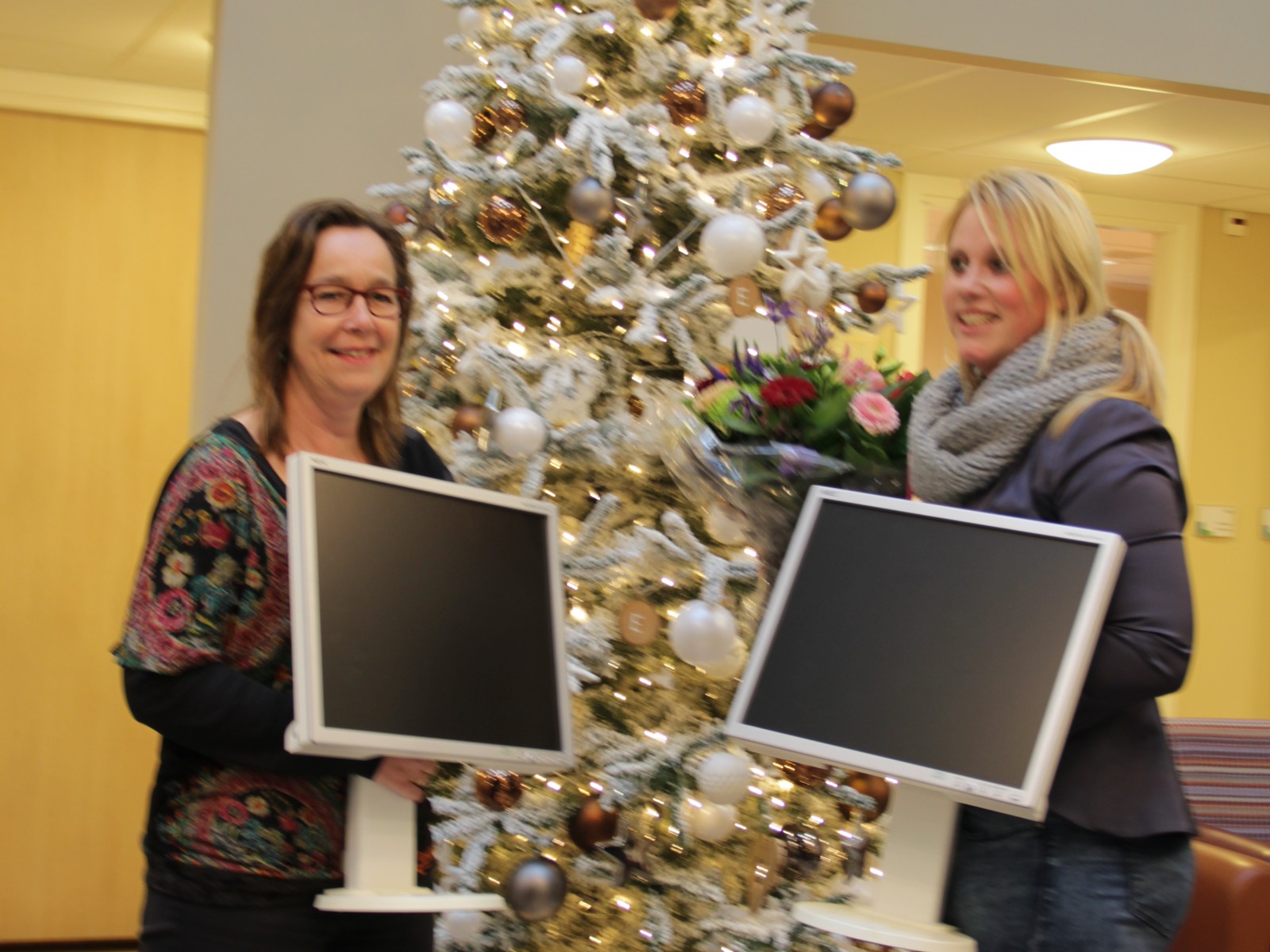 Foto: Zoë Berntsen van Liemerije draagt namens Hetty Kruijswijk de beeldschermen over aan Marie-José van der Velden van Bibliotheek de Liemers.