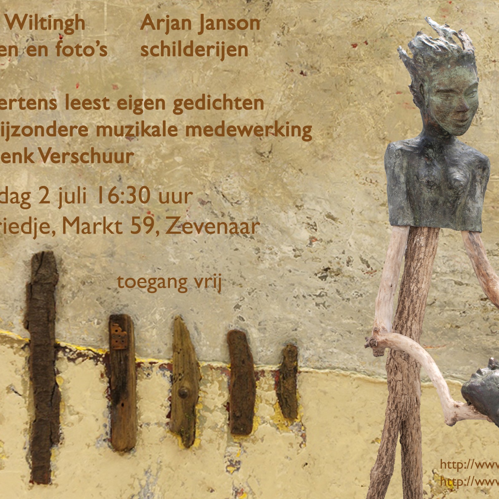 Op zaterdag 24 juni opent een bijzondere expositie in Galeriedje aan de Markt 59 in Zevenaar. Arjan Janson presenteert zijn abstracte schilderijen en Marjo Wiltingh toont foto’s en beelden. Beiden laten zich inspireren door de natuur en spelen graag met verschillende materialen die op verrassende wijze gecombineerd worden. De kunstwerken vullen elkaar prachtig aan en zorgen voor een mooie uitgebalanceerde expositie.