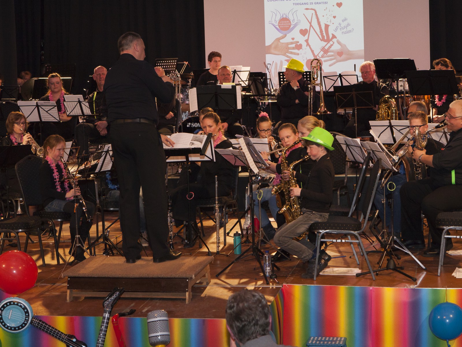 Met een strak programma in een kleurrijk decor gaan we van start, veel vernuftige overgangen, waarbij toch de mooiste ingeleid wordt door pianospel met iele hoge klanken van kinderliedjes, we gaan snappen dat de kids nu toch echt gaan komen. Zij spelen wellicht voor het eerst voor het grote publiek trompet, dwarsfluit of klarinet. Vol vertrouwen nemen ze hun plaats in en start de muziek. Je voelt een siddering van bewondering door het publiek; dit is echt het hoogtepunt van de middag en deze kids in action krijgen een dik verdiend applaus.