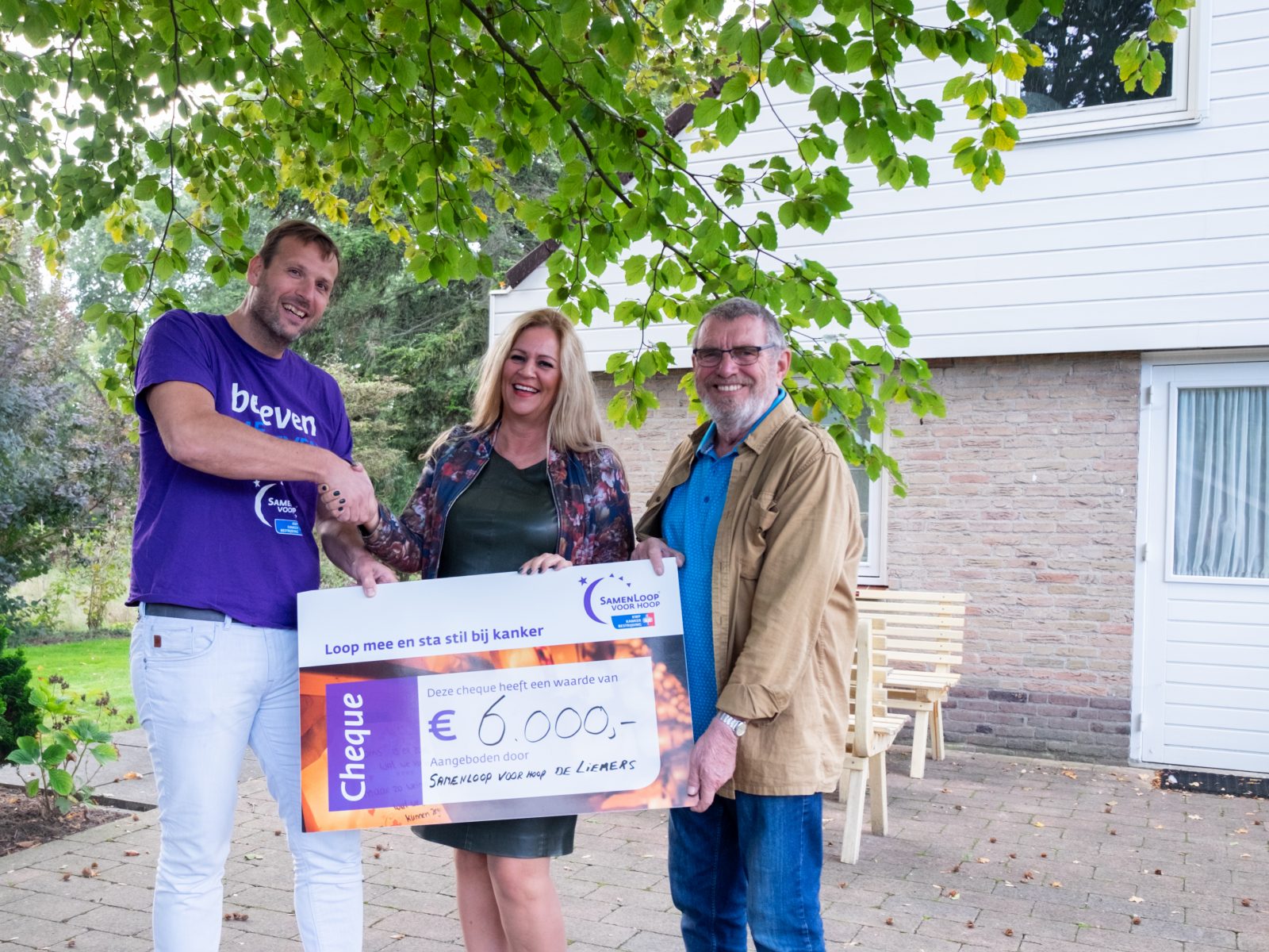 Afgelopen week heeft de organisatie van de SamenLoop voor Hoop de Liemers een cheque overhandigd aan het Braamhuis in Zevenaar. Volgens de regels van het KWF gaat 10% van de totaalopbrengst naar een lokaal doel. Ondertussen is de opbrengst opgelopen tot bijna € 60.000. Daarom konden Edwin den Heijer, vice-voorzitter en Arend Timmerman, penningmeester, met trots een cheque van € 6.000 overhandigen.