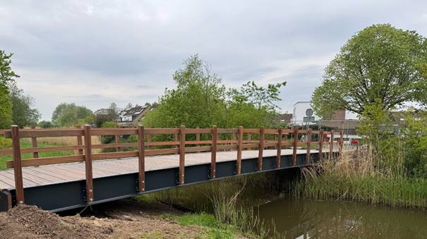 De afgelopen weken bouwden de bruggenbouwers van Meerdink de circulaire brug voor De Kemfkens in hun werkplaats in Winterswijk. Vorige week werd de oude houten brug verwijderd, de nieuwe fundering geheid en de landhoofden voorbereid. Op 23 april kwam de complete brug met speciaal transport van Winterswijk naar Westervoort en werd hij vakkundig op zijn plaats gehesen. Momenteel wordt het geheel afgewerkt, op 25 april mag hij weer gebruikt worden.