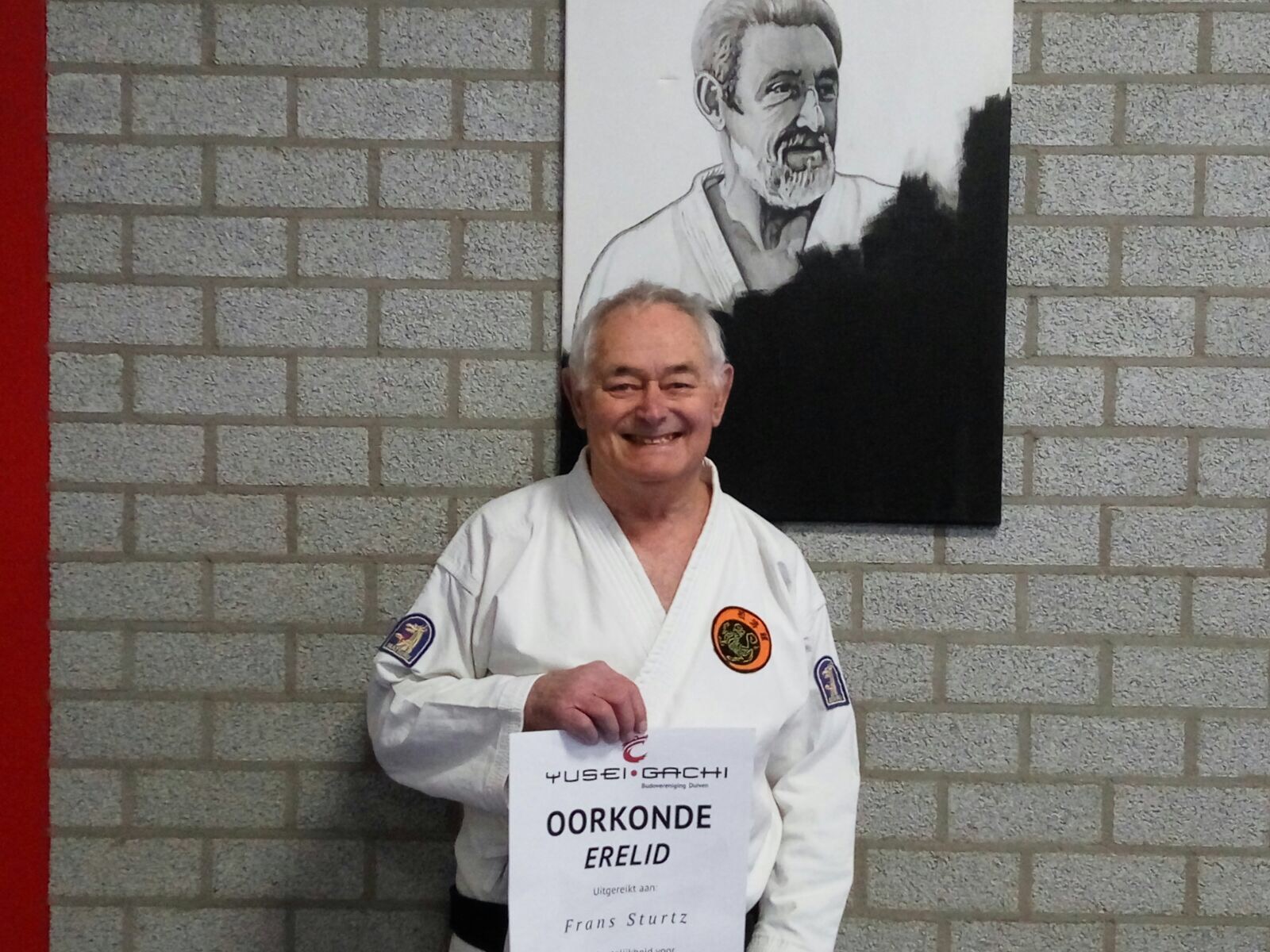 Tijdens de woensdagavond karate trainingen is Frans Stürtz geëerd te midden van zijn leerlingen. Frans is ongeveer 40 jaar betrokken bij Yusei Gachi en heeft een geweldige staat van dienst. Voorzitter Michael Abbo roemt de betrokkenheid van de 8o harige Stürtz, “Frans is een voorbeeld voor ons, hij is nog steeds actief als leraar en klust nog regelmatig aan onze Dojo”, “Persoonlijk hoop ik op dezelfde leeftijd nog zo actief te zijn”.