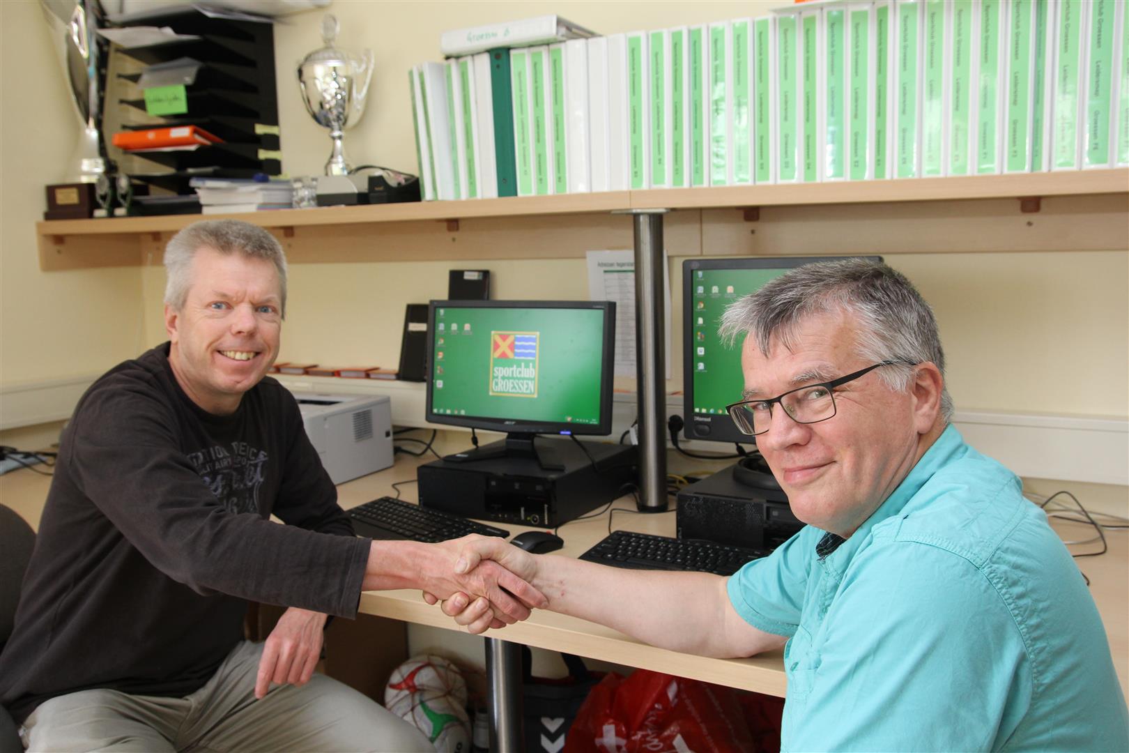 Op de foto overhandigt Koos Roelofs (rechts) namens de Club van 50 de computers aan jeugdsecretaris Marcel Bloemberg.