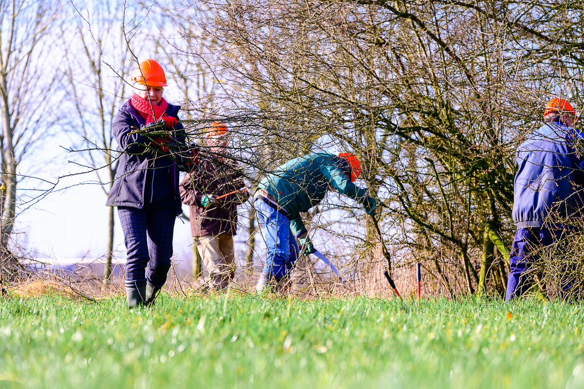 De afgelopen twee werkdagen hebben zo’n vijftien vrijwilligers houtsingels gesnoeid en bramen verwijderd. Ook is een takkenril aangelegd, als broed- en schuilgelegenheid voor vogels. Wilbert en Astrid van de Cruijsen, eigenaren van boerderij De Klaver, willen het onderhoud van de houtsingels en struweelhagen rondom hun weilanden graag aan pakken met een vaste groep vrijwilligers. Het contact met mensen maakt het werk leuker.