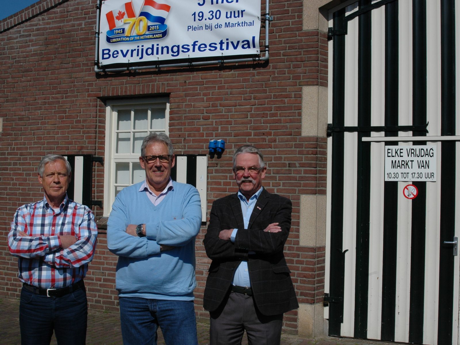 Op de foto van links naar rechts: Matthieu Krabben, Pieter Jan van den Berg en Lo Zandbergen van het Oranjecomité Didam voor de markthal, waar vandaag 70 jaar bevrijding wordt gevierd.