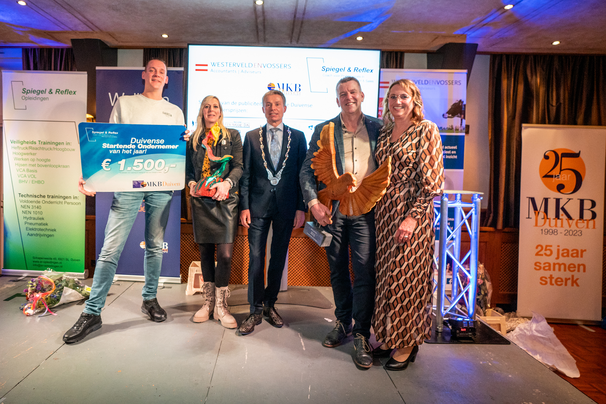 Ferdinand en Anja Eeuwes kregen uit handen van burgemeester Huub Hieltjes een beeld van de Duivense beeldhouwer Will Schropp. De prijs voor Marieke en Walter Willemsen was een beeld van kunstenaar Maarten van der Geest, dat werd uitgereikt door Jeroen en Levine van de Pavert die vorig jaar ondernemer van het jaar werden. Marieke en Walter ontvingen ook een coachingstraject bij Spiegel & Reflex Opleidingen.