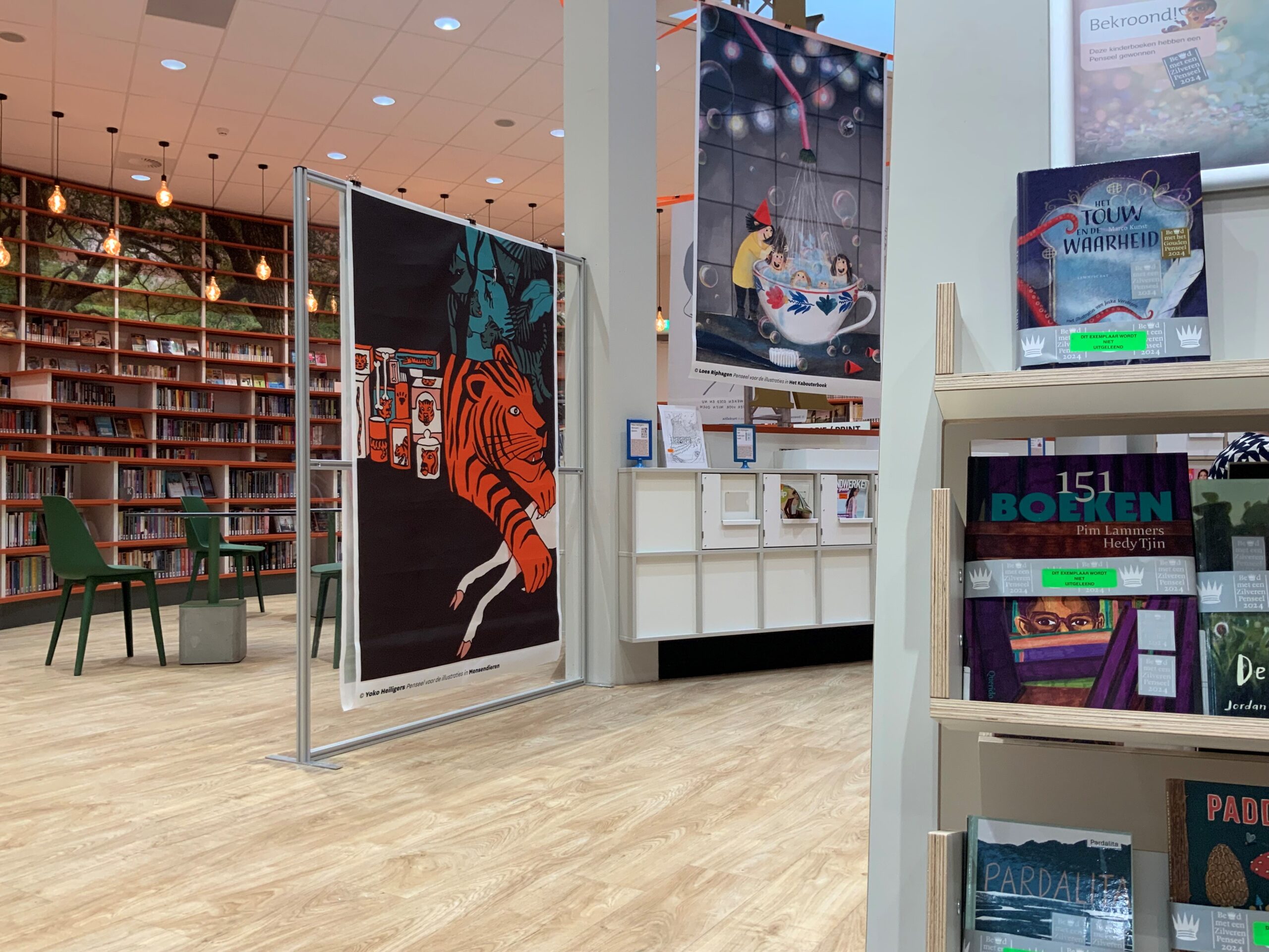 Ieder jaar worden in aanloop tot de Kinderboekenweek prijzen uitgereikt voor de beste kinderboeken. Een vakjury bekroond boeken met een Penseel (voor de illustraties) of Griffels (voor de tekst). Dit jaar kregen acht boeken een Zilveren Penseel. De Gouden Penseel ging naar het boek ‘Het touw en de waarheid’ met illustraties van Jeska Verstegen. In de bibliotheek is van ieder van de met een Zilveren Penseel bekroonde boeken één illustratie op een heel groot doek te zien. De prijswinnende boeken zijn bovendien te bekijken en – na oktober – natuurlijk ook te leen in de bibliotheek.