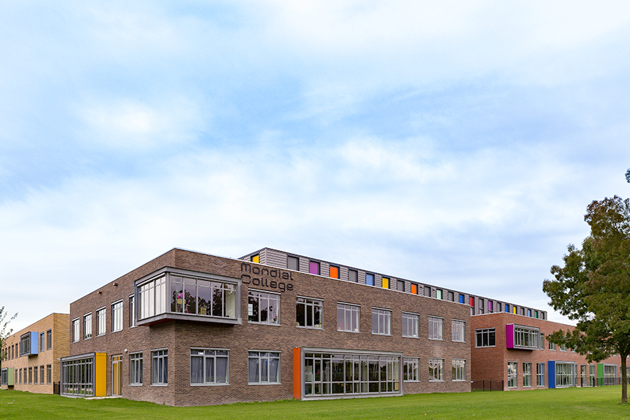 Het Mondial College in Nijmegen is de eerste VO school met een duurzaamheidscertificaat. Door slimme investeringen in duurzaam bouwen is het BREEAM-NL Good nieuwbouw oplevercertificaat behaald. Kenmerkend in het ontwerp van Factor Architecten is het kleurgebruik en de glazen elementen.