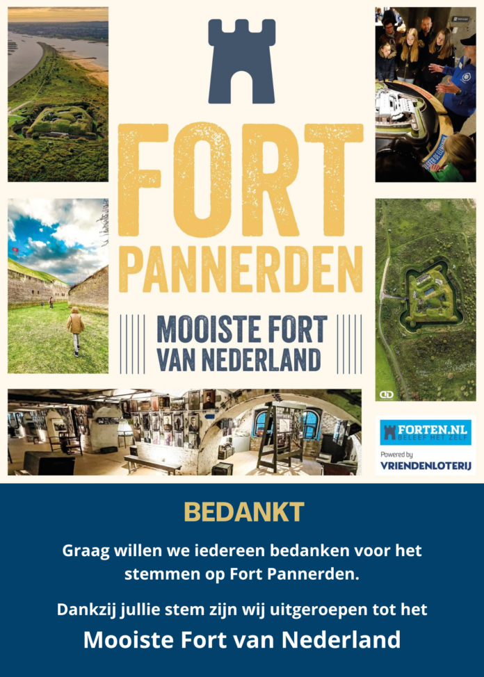 Of het nu een torenfort, een lunet of een werk is, veel versteende ridders werden in de afgelopen 20 jaar levende forten. Bij de één vergader je, bij de ander geniet je op een terras of bezoek je het museum. In april 2023 startte de Mooiste Fort verkiezing. Tot 1 juli kon er op 88 forten worden gestemd. Vijf forten gingen door naar de tweede en laatste ronde: Fort aan de Klop, Fort bij Kudelstaart, Fort Kijkduin, Fort Pannerden en GeoFort. Publiek kon tot 1 september jl. op één van deze verdedigingserfgoed-locaties stemmen op mooistefort.nl. Op 4 september werd directeur Jos Peters ervan op de hoogte gebracht dat zijn Fort Pannerden de mooiste is.