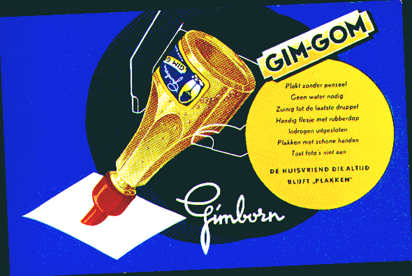 Gimborn maakt ook inktlinten voor schrijfmachines, inkt voor stempelkussens en verf. In allerlei kleuren en soorten. Zoals de beroemde lijm: Gim-Gom. Deze lijm zat in een glazen flesje met een handig dopje waarmee je de lijm op het papier smeerde.