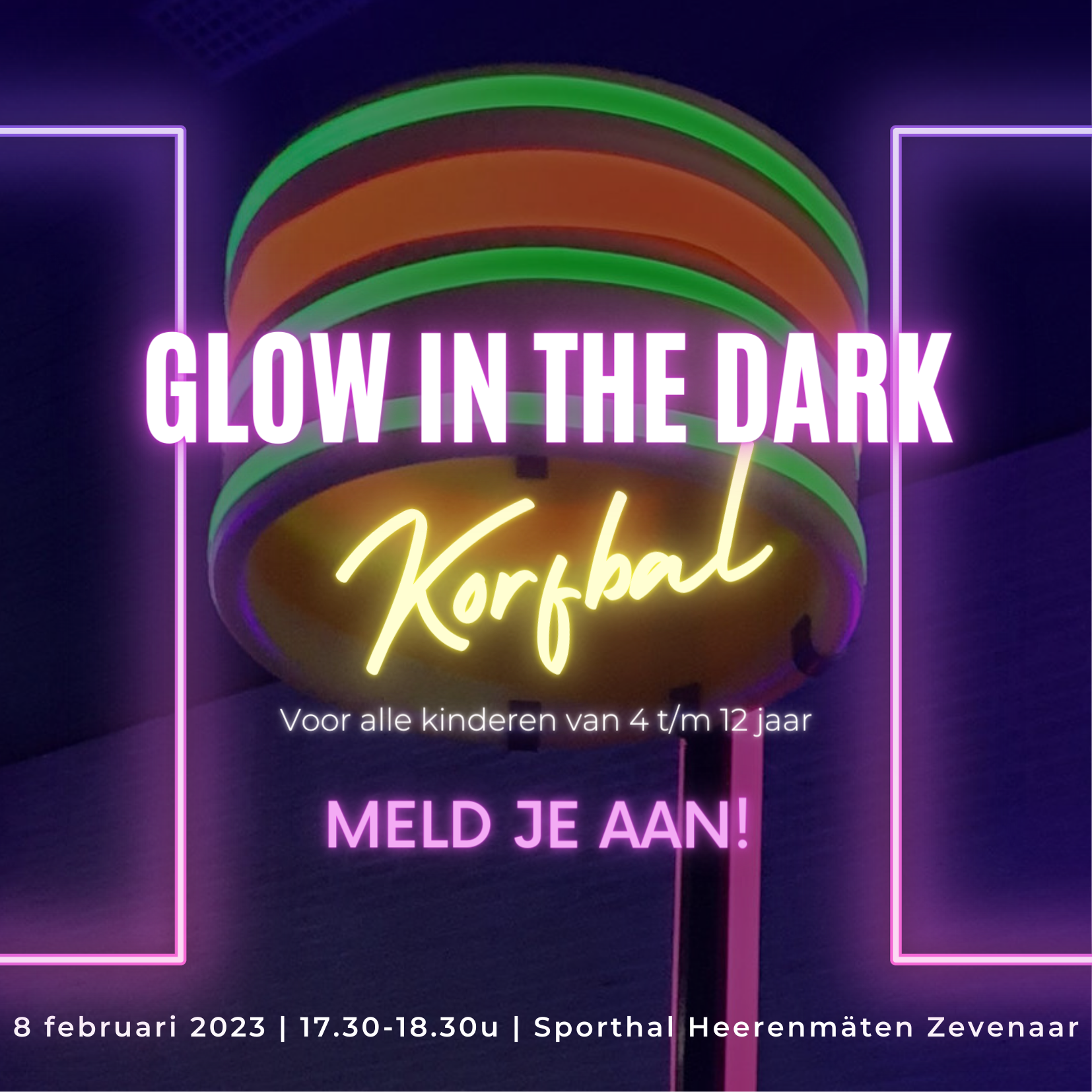 Voor basisschoolkinderen uit Zevenaar, Didam en omstreken organiseert KV de Zwaluwen op woensdag 8 februari 2023 een spectaculaire Glow in the Dark training. De Zevenaarse korfbalvereniging tovert Sporthal Heerenmäten, in het winterseizoen de thuishaven van de club, om tot drie fantastische donkere zalen. In de eerste twee zalen maken de kinderen in groepjes kennis met elkaar, korfbal en natuurlijk de trainers. Zodra het gooien, vangen en schieten op de korf onder de knie is, spelen de kinderen in de derde blacklight-zaal ook daadwerkelijk een wedstrijdje Glow in the Dark korfbal. Trek dus felgekleurde glow in the dark sportkleding aan, felle neon kleuren zoals oranje, geel en groen zie je heel goed in UV licht!