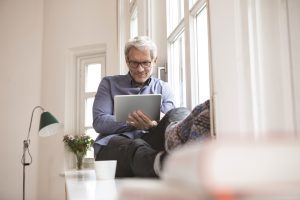 HomeGratis workshops over de digitale overheid én digitale zorgMature man at home sitting at the window using tablet