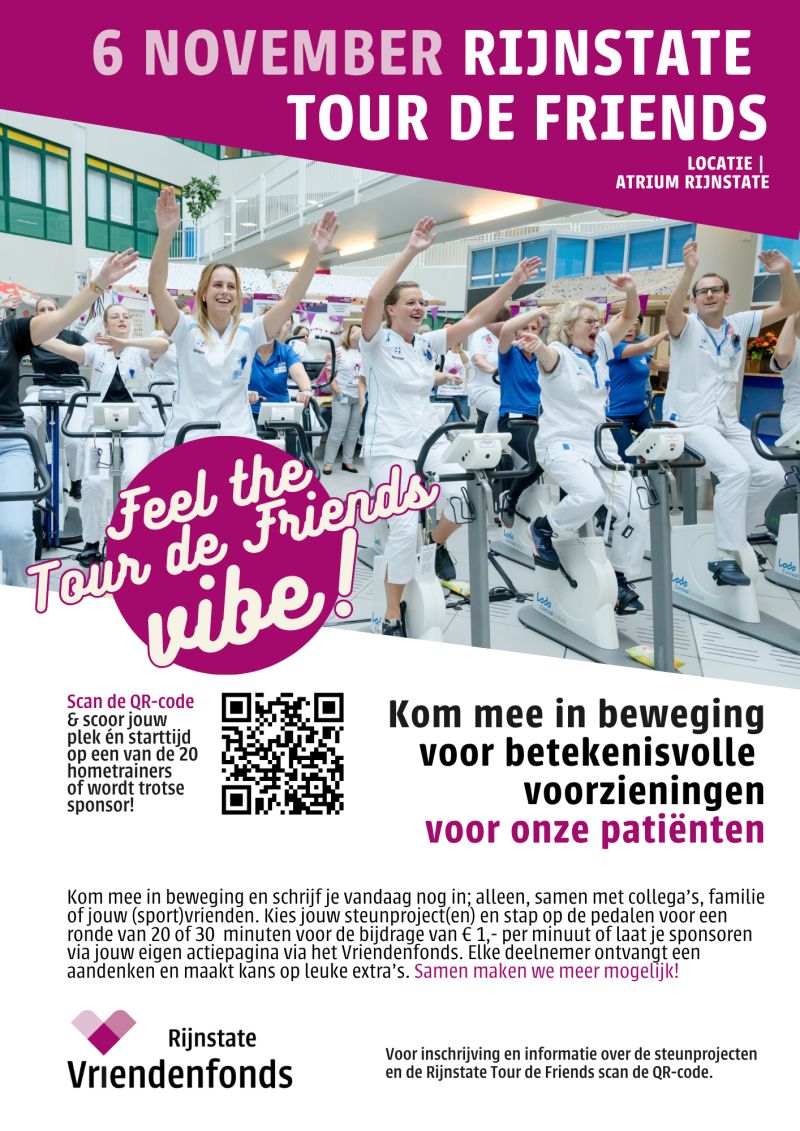 Donderdag 6 november is de ontvangsthal van Rijnstate Arnhem tussen 13.00 en 19.00 het domein van deelnemers aan de Rijnstate Tour de Friends. Zes uur lang fietsen voor het goede doel op 20 (!) hometrainers. Rijnstate staat die dag in het teken van gezelligheid en bewegen. Iedereen is welkom, je kunt individueel meedoen of samen met collega’s, vrienden of familie.