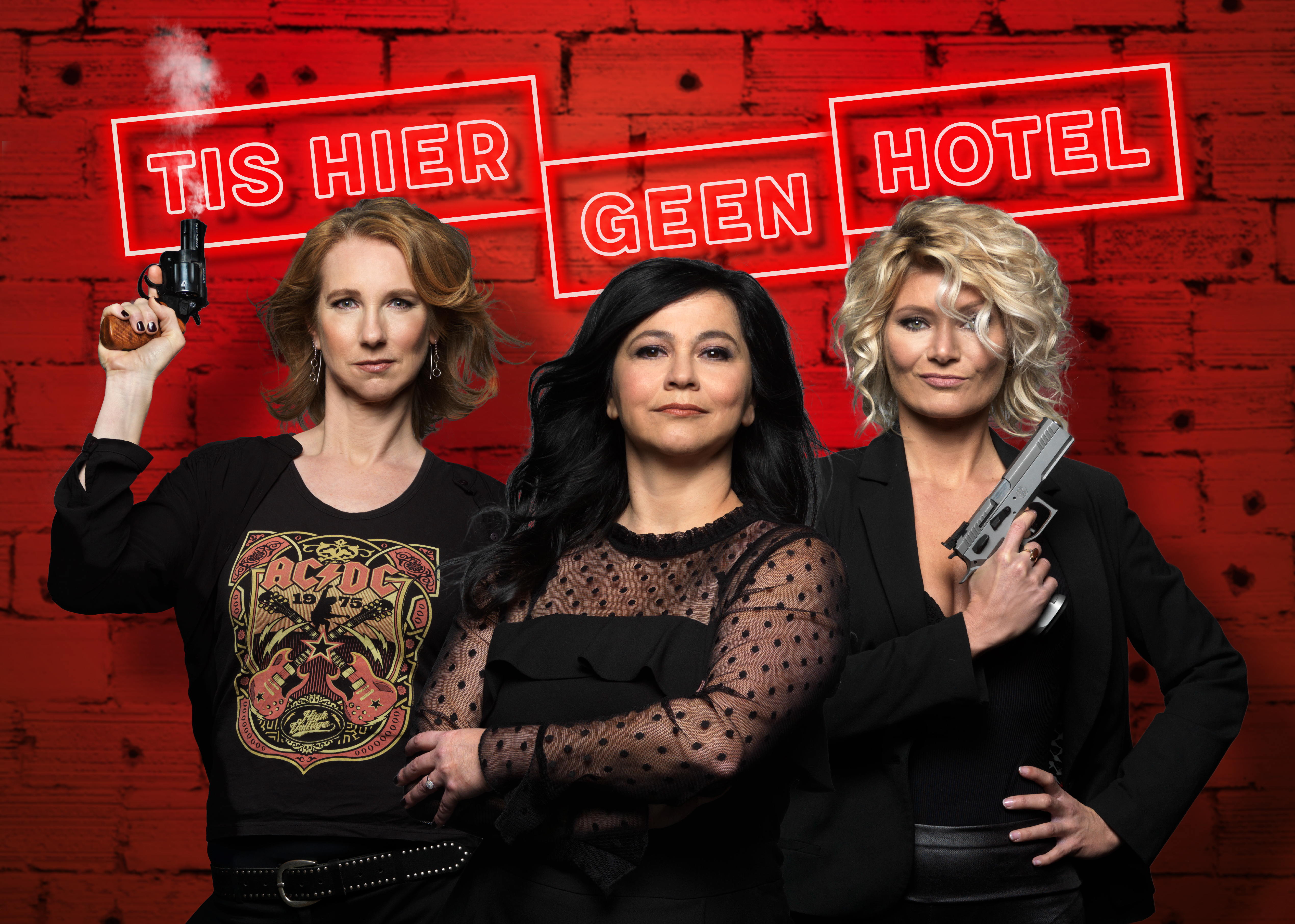 De theatermakers Hanneke Drenth, Dianne Liesker en Ellen Dikker staan komend seizoen niet alleen met de voorstellingen Tis Hier Geen Hotel op de planken, ze maken hem ook zelf. “De voorstelling is gebaseerd op de website tishiergeenhotel maar wij hebben verder de vrije hand gekregen. En dat is natuurlijk erg leuk”, zegt Hanneke Drenth. “De afgelopen jaren, sinds ik vijf jaar geleden stopte met Dames Voor Na Vieren, speelde ik vooral rollen in musicals en toneelstukken. Maar ik ben natuurlijk ook theatermaker en geniet erg om weer zelf iets te maken.” En in dit proces vullen de dames elkaar goed aan. “We hebben ieder een eigen discipline. De een is stand-upper, de ander schrijft en schrijft grappige scènes en ik schrijf zelf vooral veel liedjes en ook scènes. We hebben regisseur Jeroen Woe die alles monteert. Het is heel fijn om samen te werken.”