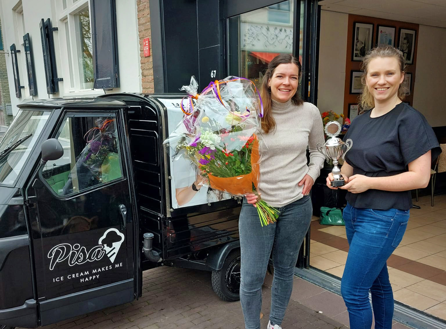Fotobijschrift: Eigenaar Coco Strijbosch van IJssalon Pisa (links) krijgt de Voedselveiligheid Bokaal overhandigd door Pam Papen van Houwers.