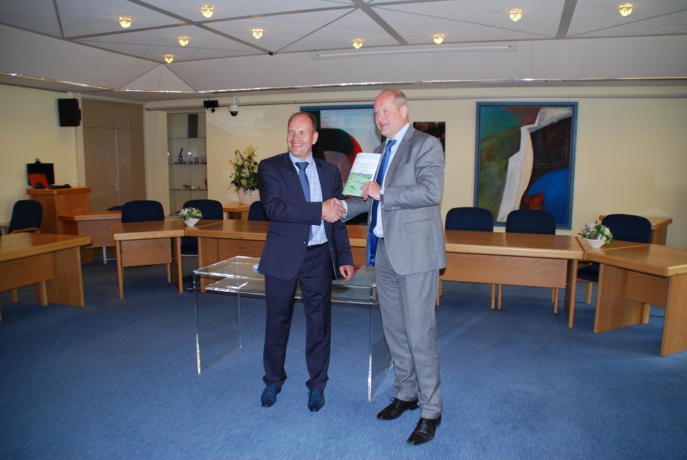 Het Uitvoeringsplan is in aanwezigheid van alle partners door wethouder Arthur Boone (links) uitgereikt aan gedeputeerde Van Dijk van de provincie Gelderland.
