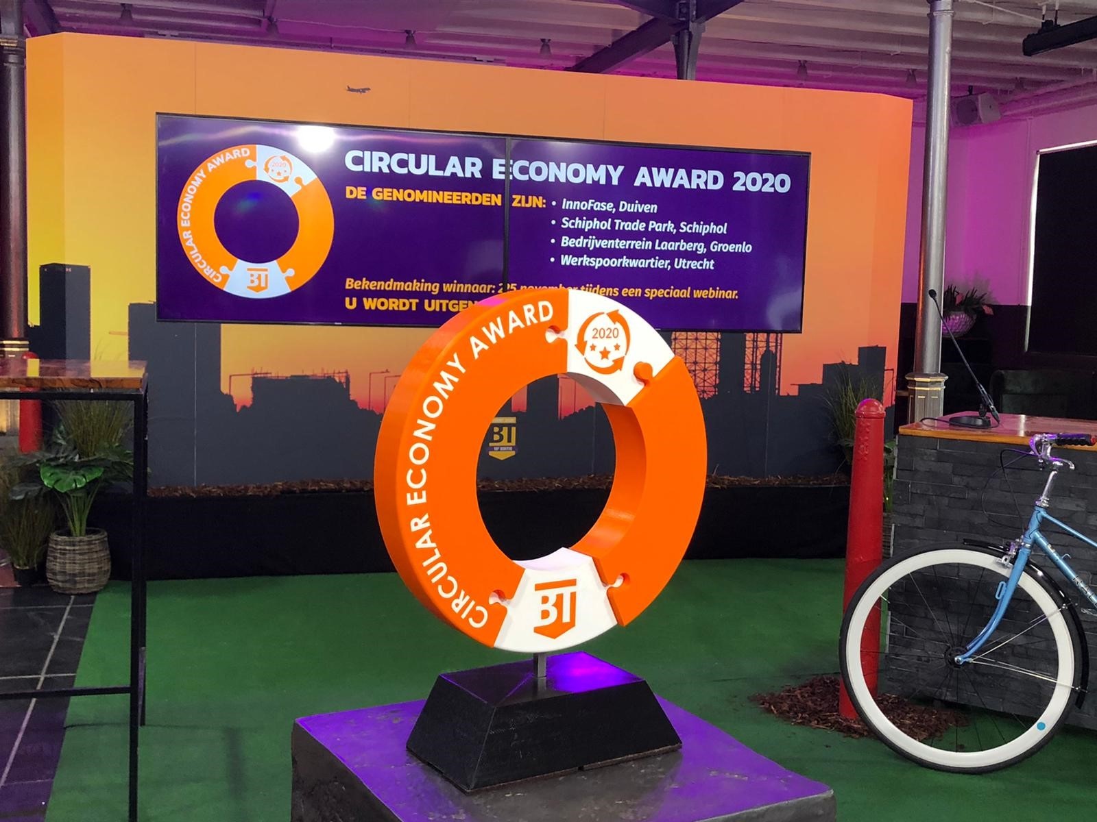 De Circular Economy Award wordt dit jaar voor de vierde keer georganiseerd. Het doel is om een pluim te geven aan werklocaties die het beste uitvoering geven aan circulaire ambities en nadrukkelijk ook de samenleving betrekken, met inbegrip van het bedrijfsleven. Tijdens het BT Congres op 29 oktober werden uit een longlist van 35 kandidaten vier kanshebbers voor de Circular Economy Award 2020 geselecteerd: InnoFase in Duiven, Schiphol Trade Park, Bedrijventerrein Laarberg in Groenlo en het Werkspoorkwartier in Utrecht.