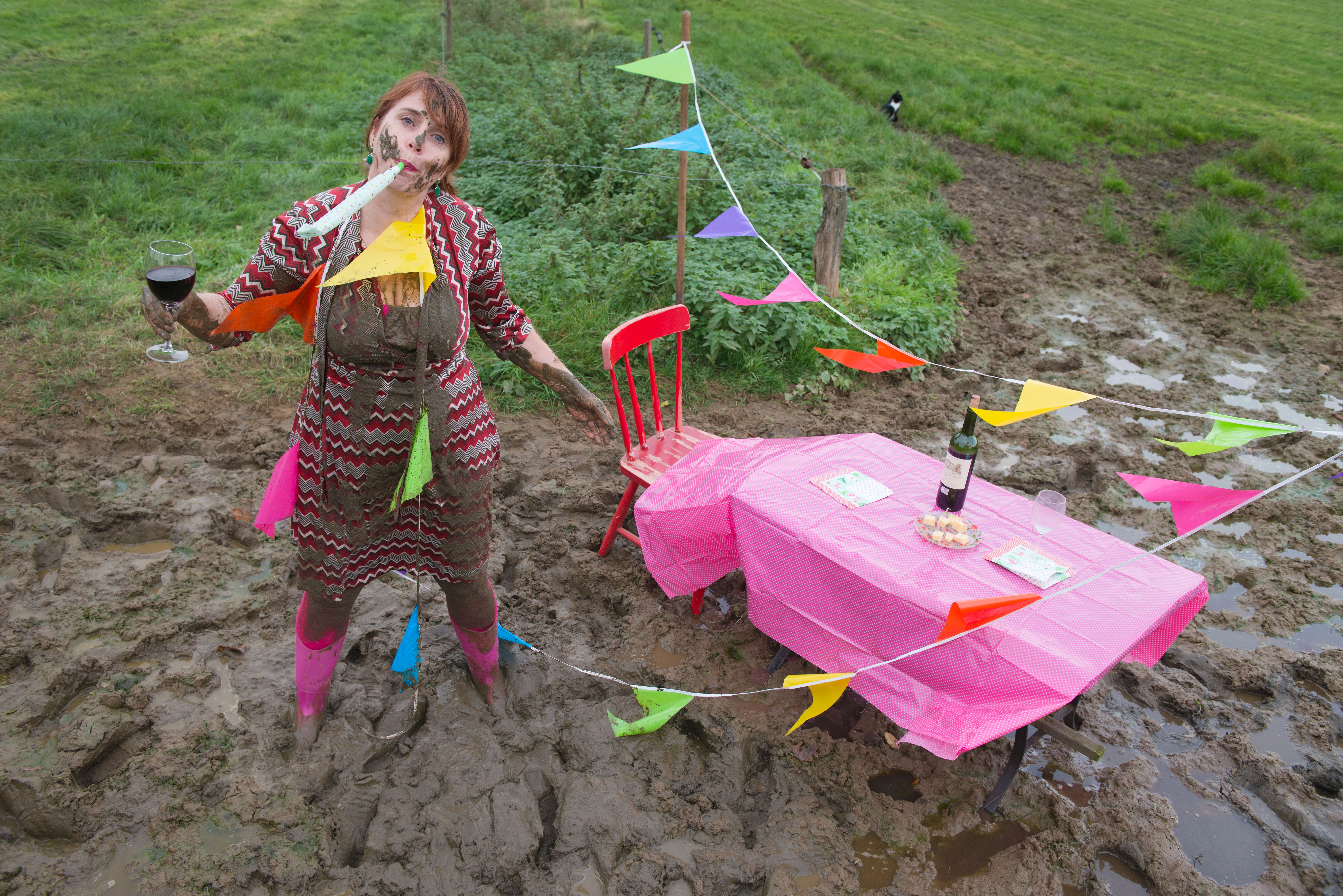 Er zijn mensen die zeggen: het leven is een feest, je moet alleen zelf de slingers ophangen. Dat zijn van die mensen die alles op orde hebben en schijnbaar het leven naar hun hand zetten. Ze kunnen ’s morgens altijd schone, gestreken sokken vinden, op kleur gesorteerd in hun kast. Omdat ze zo lekker praktisch zijn. En als het tegen zit zeggen ze: ‘Het heeft zo moeten zijn’. Irene van der Aart moddert maar wat aan. Haar meest gebezigde woorden zijn: ‘Mijn glas is niet halfvol, het is niet halfleeg; er heeft nooit iets ingezeten.’ Maar ze komt er wel eerlijk voor uit dat ze een zwartkijker is. In Nederland wonen voor de rest veel optimisten in schaapskleding. Omdat het wel een beetje gezellig moet blijven zal Irene in haar voorstelling af en toe een slinger ophangen.