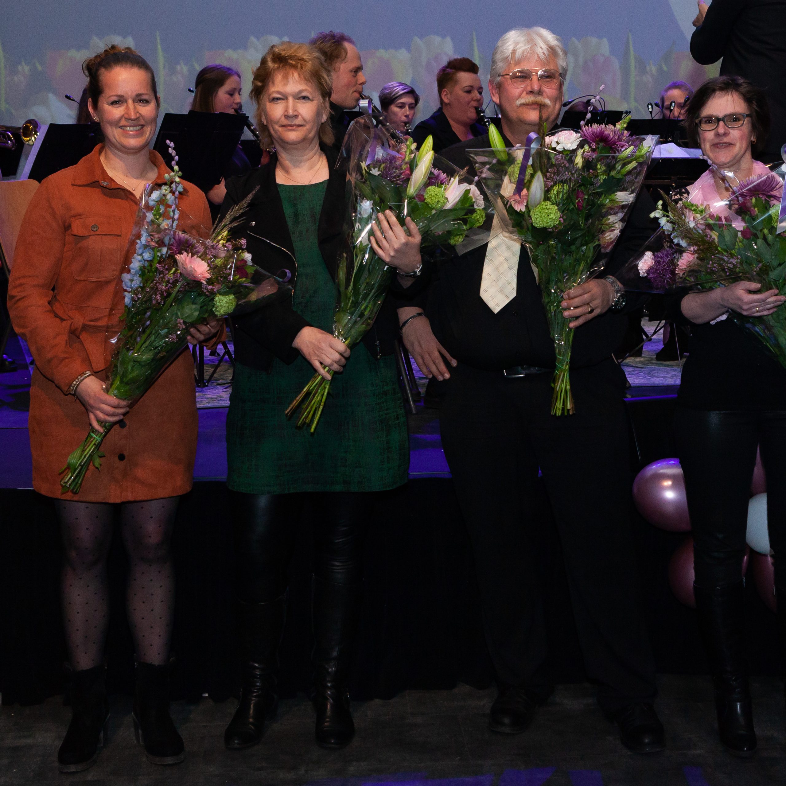 Op zaterdag 9 april heeft Liemers Harmonie Duiven vier jubilarissen gehuldigd tijdens het Lenteconcert. Corine Sonderen en Bianca Mulder waren beiden 25 jaar lid van Liemers Harmonie Duiven. Geron Hugen en Ellen Meijndershagen waren 40 jaar lid van de vereniging. De leden kregen een bos bloemen en de vernieuwde verenigingsspeld met het logo van Liemers Harmonie Duiven.