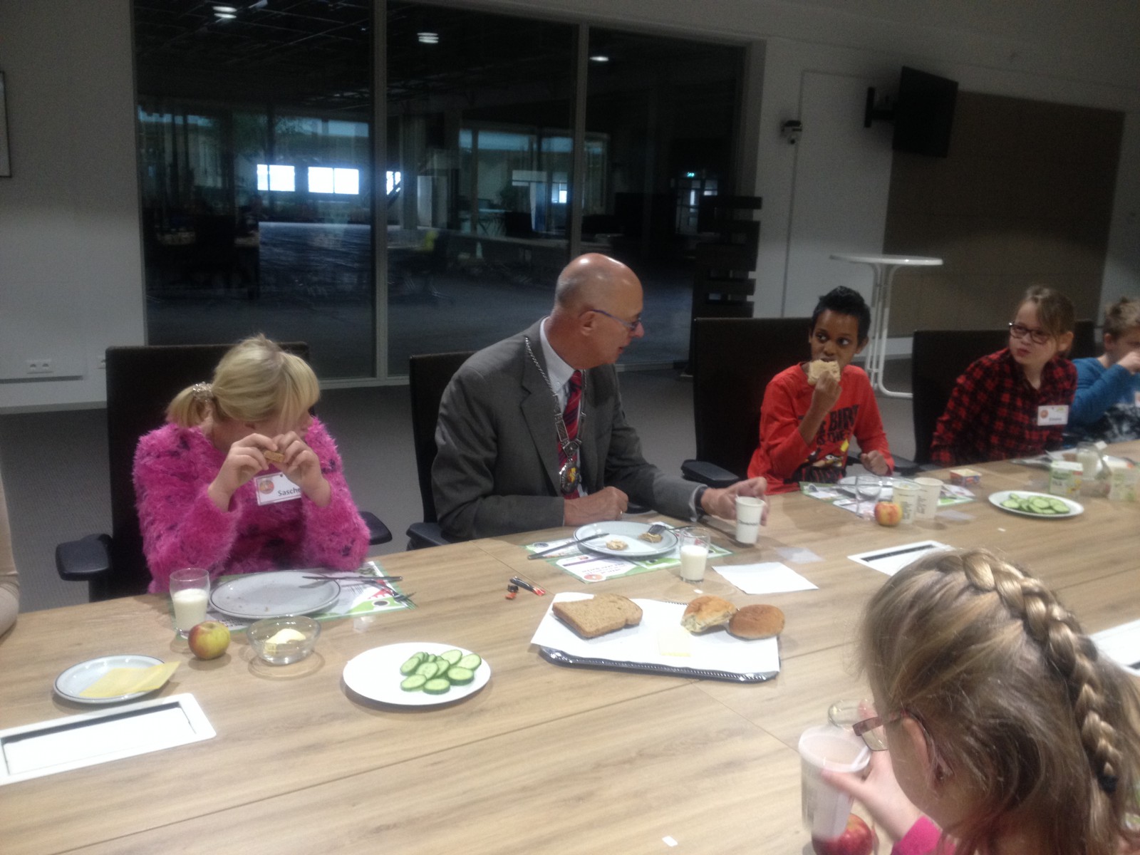 Vanochtend brachten 16 kinderen van SBO de Schilderspoort uit Zevenaar een ontbijtje bij burgemeester Jeroen Staatsen op het gemeentehuis. In de raadzaal gaven ze met dat gezamenlijk Burgemeestersontbijt het goede voorbeeld in de week van het Nationaal Schoolontbijt, waarbij zo’n 520.000 kinderen samen gezond ontbijten op 2.720 basisscholen.