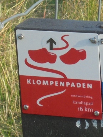 De route is herkenbaar aan de rood witte bordjes/stickers met klompen die links of rechts van de route zijn aangebracht