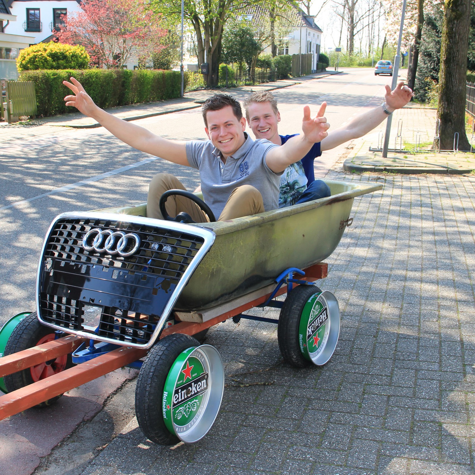 Toen de zeepkistenrace onlangs aan de bar bij Wieleman ter sprake kwam, gaven René en Reinder aan mee te zullen doen. Weliswaar als grap, maar toch houden ze zich aan hun woord. René weer: “Voor een kratje bier hebben we van iemand een oude skelter gekocht en de badkuip hebben we ‘gestolen’ uit het weiland van de opa van Reinder. De kuip staat op houten balken, die op het onderstel zijn geschroefd. Officieel zou het verantwoord moeten zijn.”