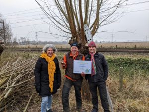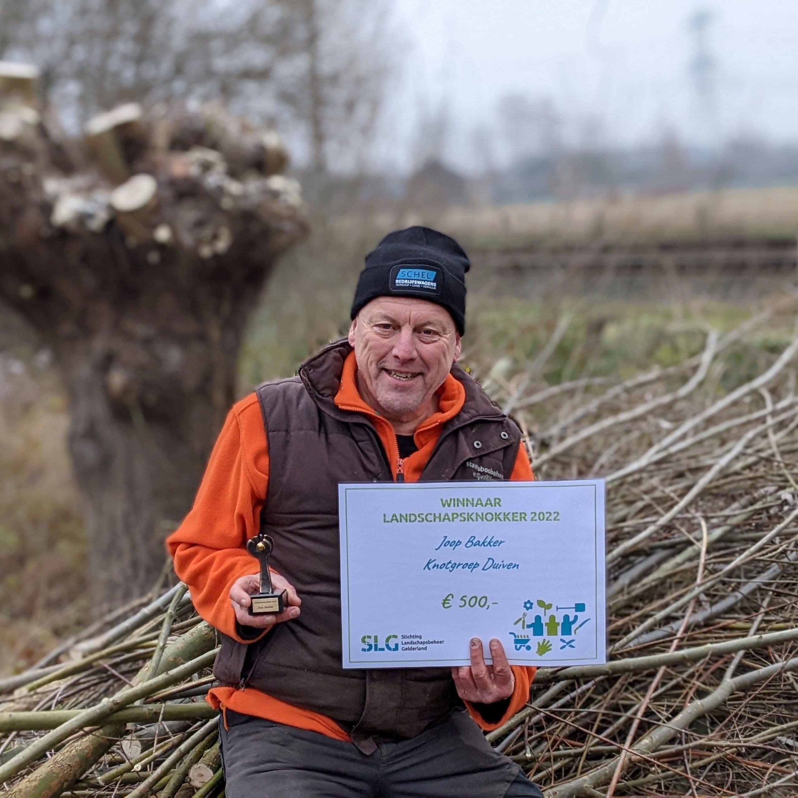 Joop Bakker, coördinator van Knotploeg Duiven is uitgeroepen tot Landschapsknokker 2022. De Landschapsknokker is een vrijwilliger die zich al langere tijd bijzonder inzet voor het landschap en het verdient om in het zonnetje gezet te worden. Joop ontving de Landschapsknokker op zaterdag 17 december uit handen van directeur-bestuurder Arjan Vriend van Stichting Landschapsbeheer Gelderland (SLG), tijdens de werkdag van de vrijwilligersgroep. Wethouder Gemma Tiedink van gemeente Duiven was ook aanwezig. De prijs bestaat uit een bronzen beeldje en een geldbedrag van € 500 te besteden aan het landschap.