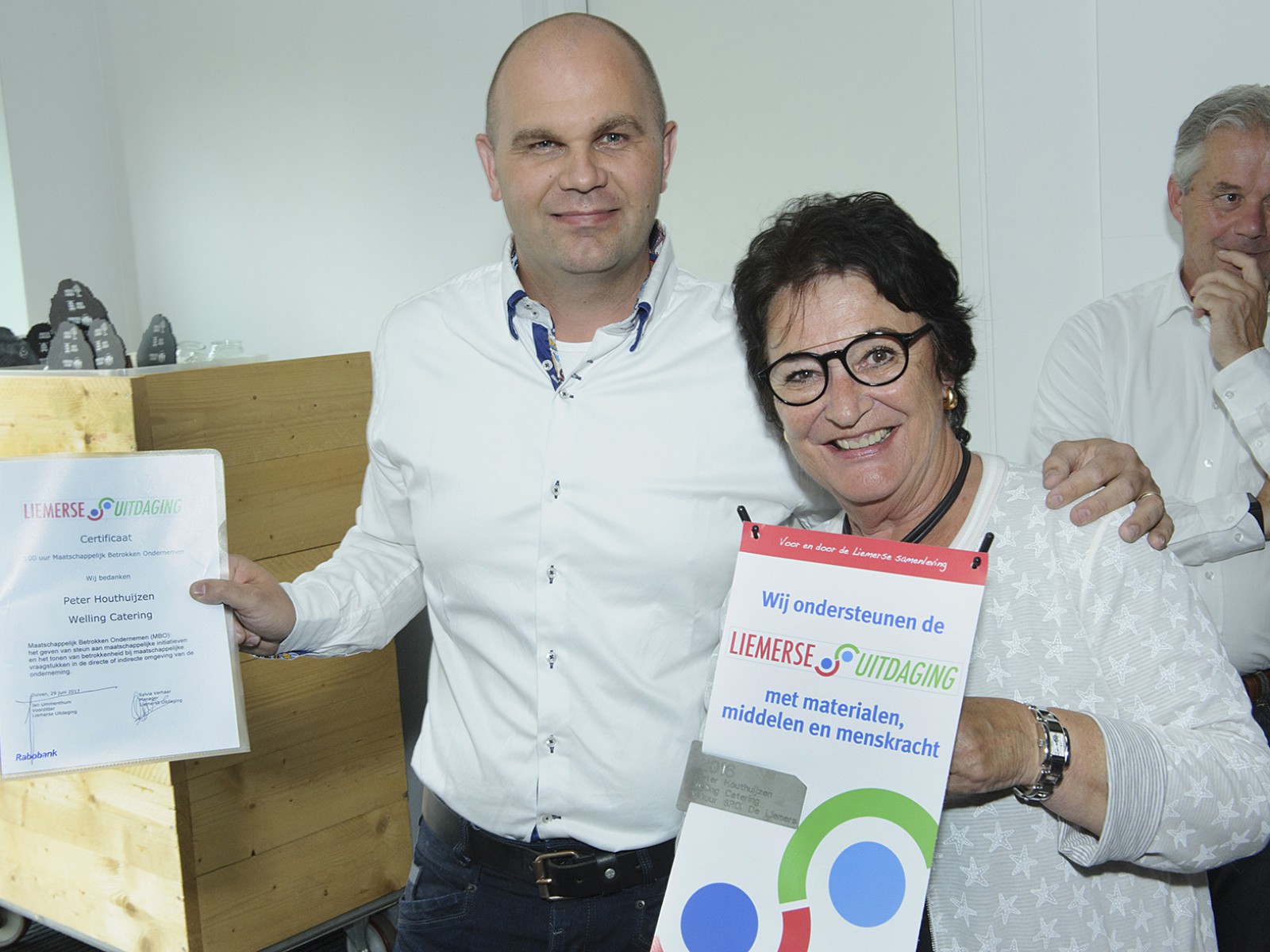 Jan Ummenthum: “Onze bestuursleden Axel Jansen (Jazo) en Harald Wiggers (Liemerse College) namen het initiatief voor dit Social Return on Investment certificaat. Het is een blijk van waardering voor diegenen die zich met gesloten portemonnee voor de Liemerse Uitdaging – en dus voor onze lokale gemeenschap – inzetten. We reiken dit eerste certificaat uit aan Peter Houthuijzen, omdat hij zeer breed actief is als maatschappelijk betrokken ondernemer.”