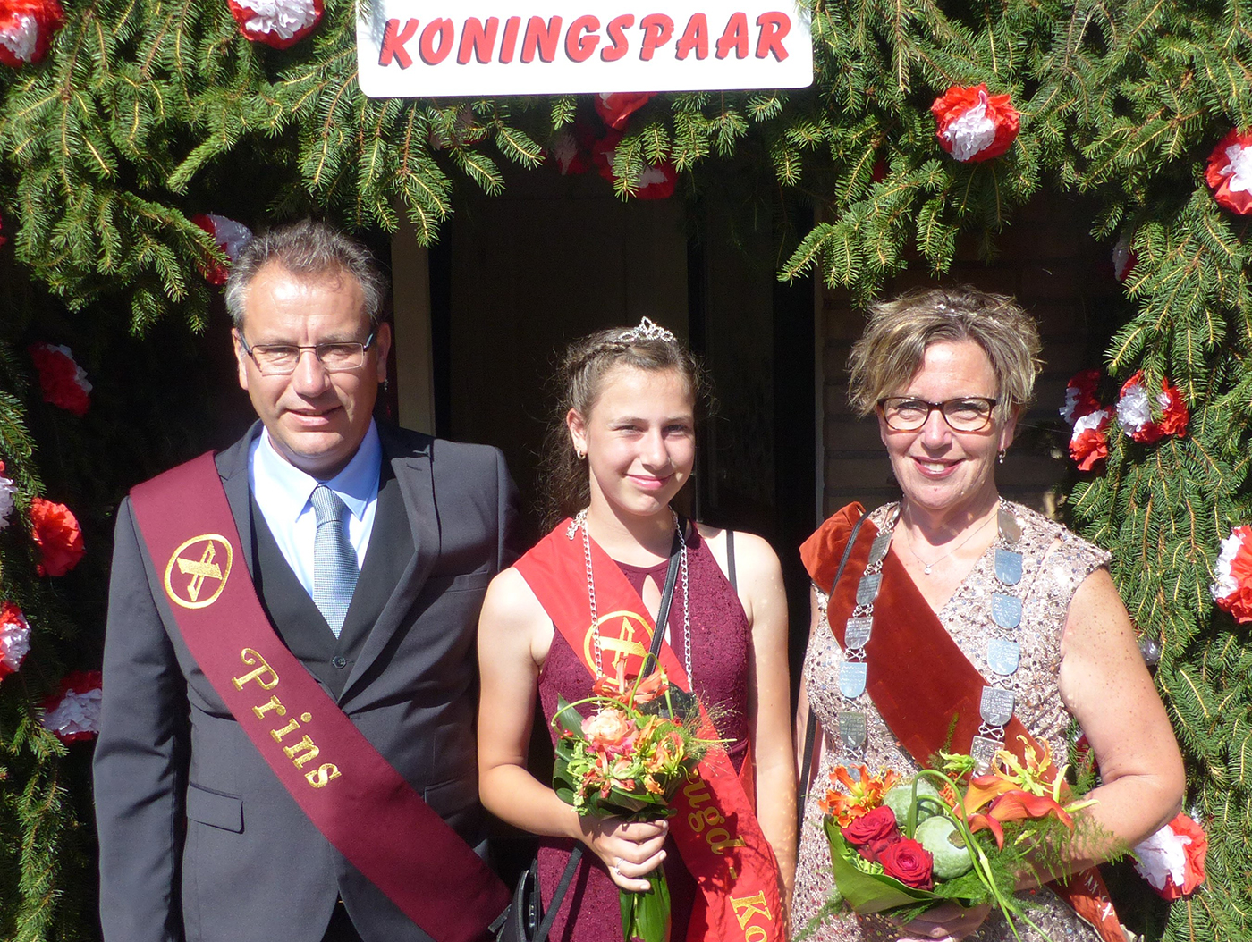 Op de foto van links naar rechts: prins Jacco Brouwer, jeugd koningin Mabel Brouwer en koningin Mascha Brouwer