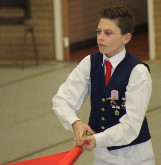 Het juniorenteam (met Jop) voorafgaand aan hun optreden waarmee zij de eerste prijs voor het acrobatisch korps showvendelen behaalden en daarmee ook Gelders kampioen werden.