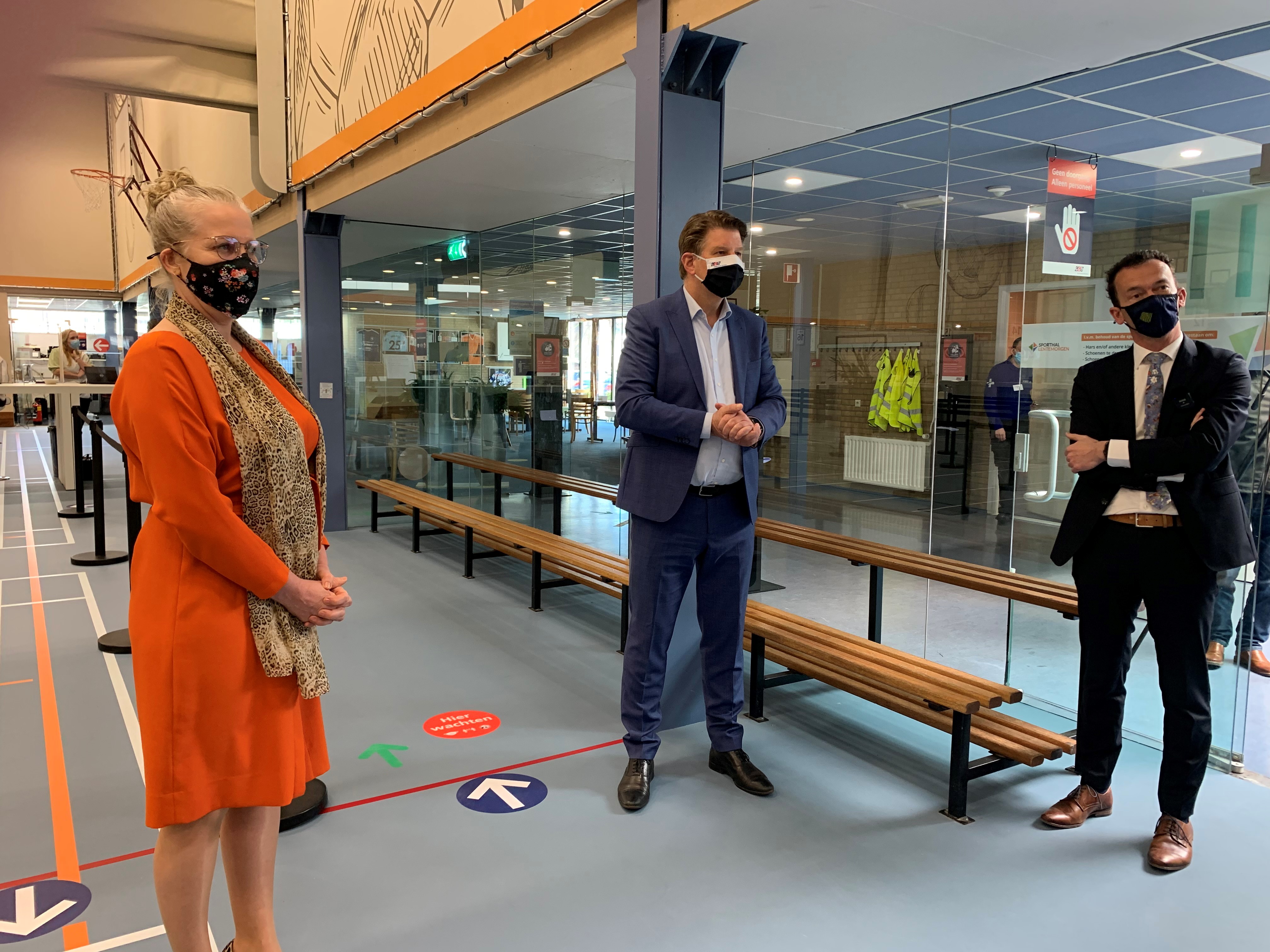 Burgemeester Lucien van Riswijk en wethouder Belinda Elfrink bezochten samen met directeur Henk Bril van de GGD Gelderland-Midden de locatie voor een werkbezoek en een gesprek met vaccinatiemedewerkers en vrijwilligers.