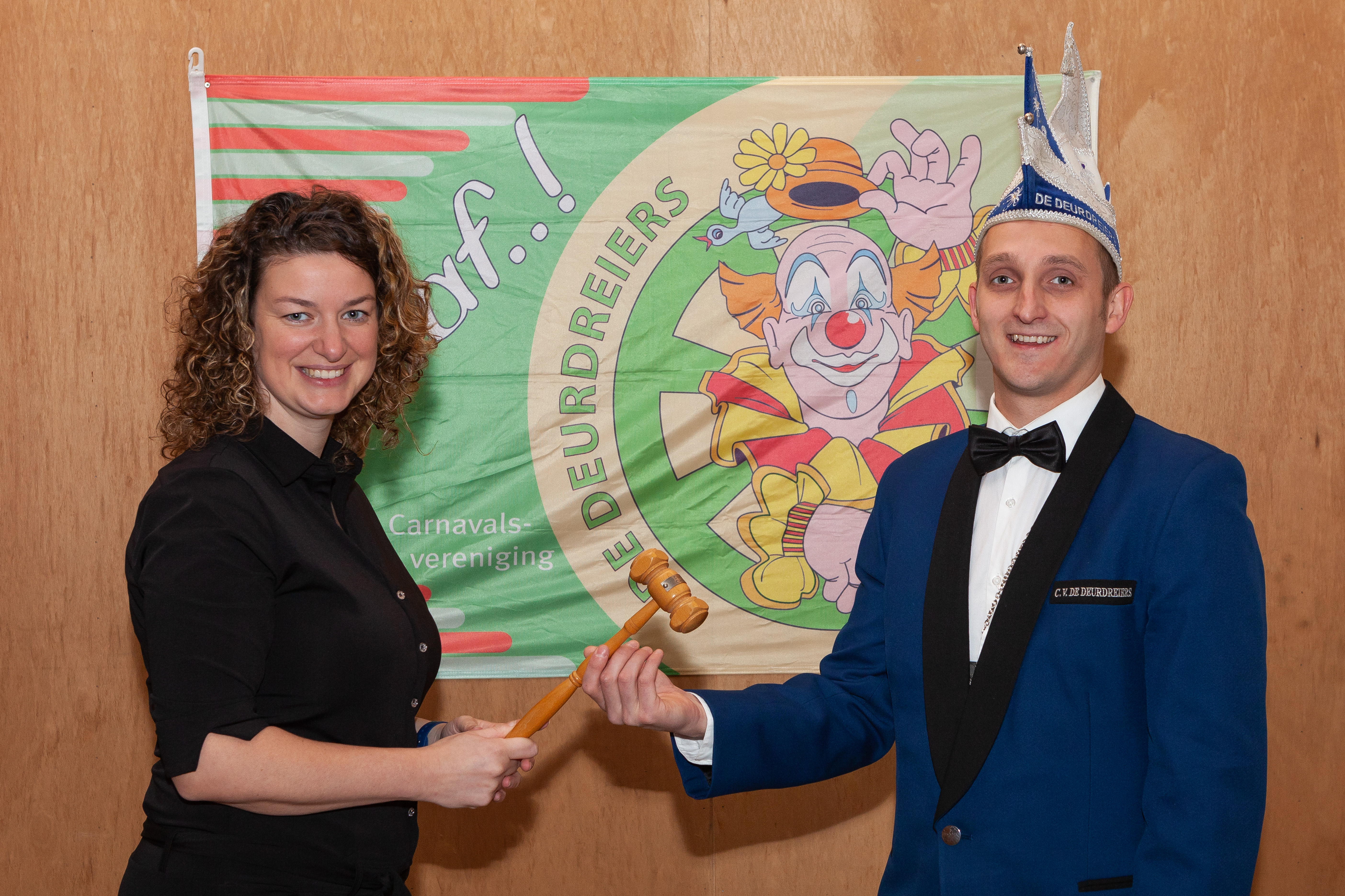 Op de foto: Omdat het tijdens de online-ledenvergadering op e 11e van de 11e fysiek niet mogelijk was, is de voorzittershamer zondagmiddag 15 november officieel voor de camera overgedragen door Kristy Leenders aan Ralf Diesvelt.
