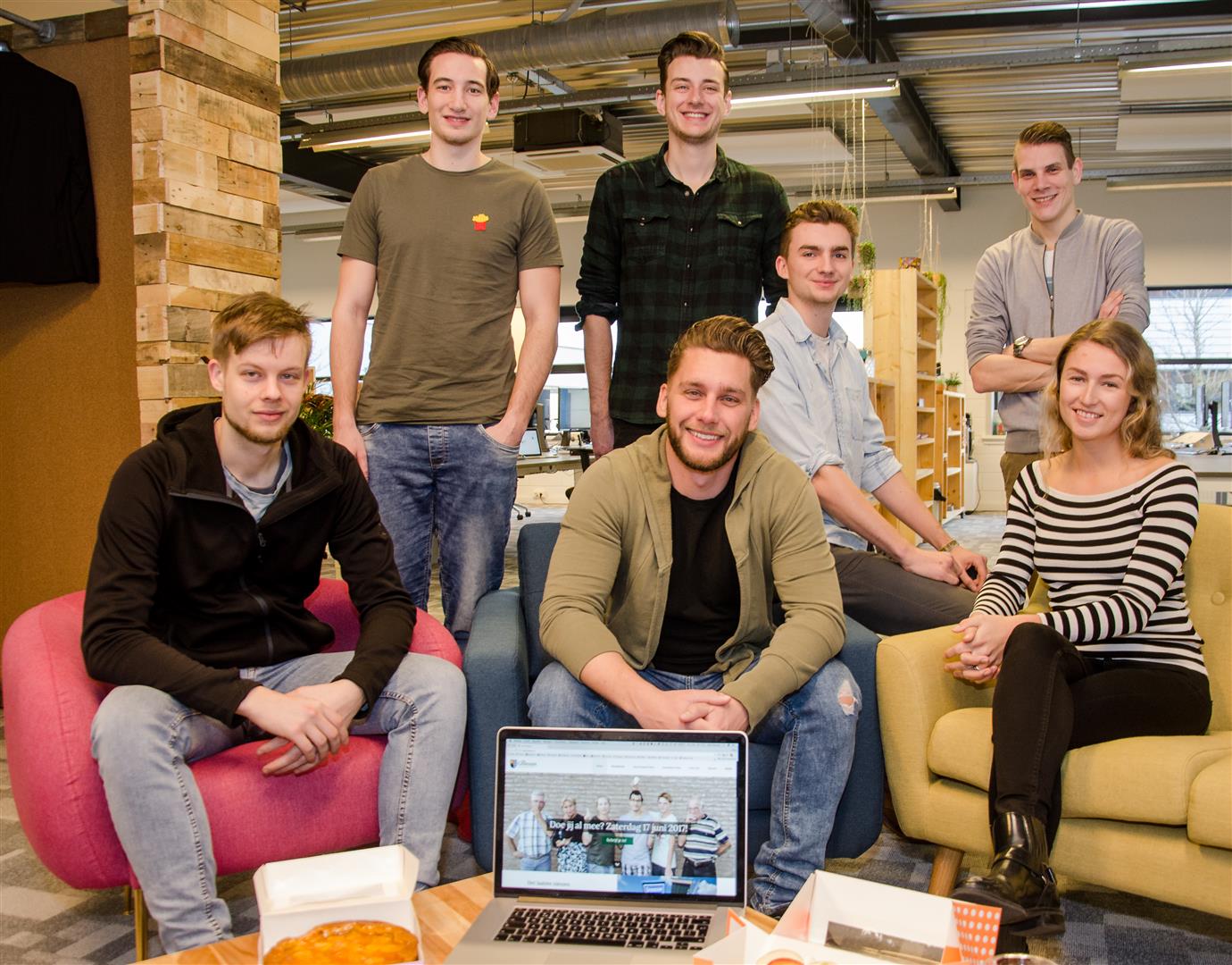 Eigenaar Milan Brouwer van BOOOM Digital (midden) en Manouk van Dijk van Das Groessen (rechts) samen met de medewerkers van BOOOM Digital.