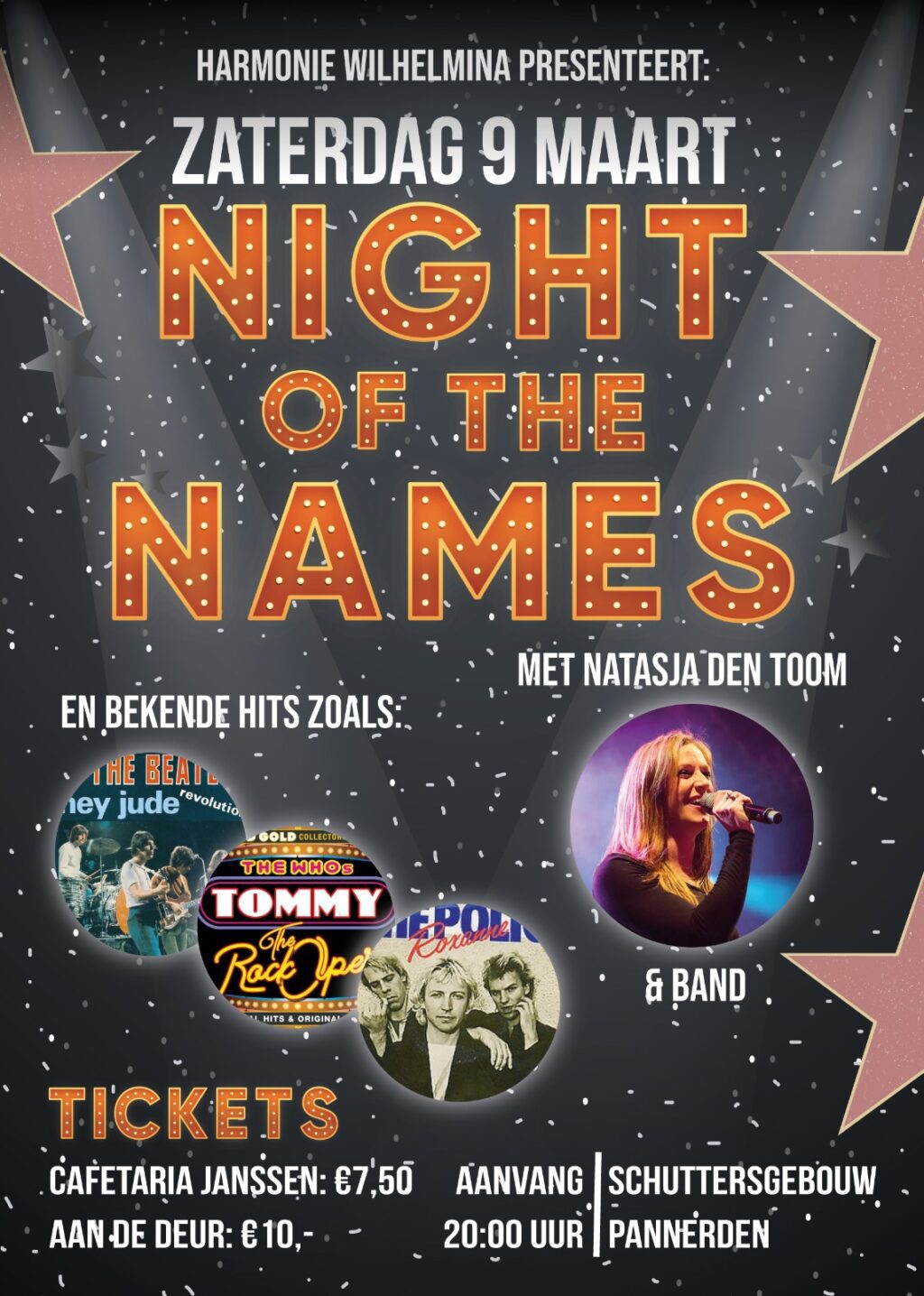 Harmonie Wilhelmina uit Pannerden maakt zich op voor een avond tussen de sterren. Tijdens de Night of the Names op 9 maart wordt de schutterstent in het Liemerse dorpje omgetoverd tot een Hollywoodwaardige feestzaal. Roze sterren tooien de ruimte terwijl bekende hits als Hey Jude, Valerie of Rosanna door de zaal schallen. Wat hebben deze nummers met elkaar gemeen? Zoals de titel van de avond al doet vermoeden, hebben alle liedjes een naam in de titel. Dit is hét moment om je in Pannerden tussen de grote sterren te wanen!