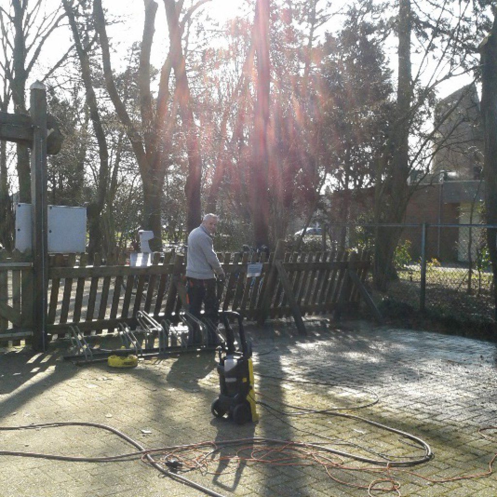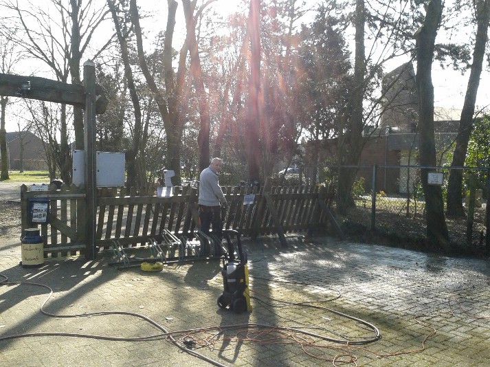 Een eenzame vrijwilliger heeft met de hogedrukspuit het hele voorterrein spic en span gemaakt.