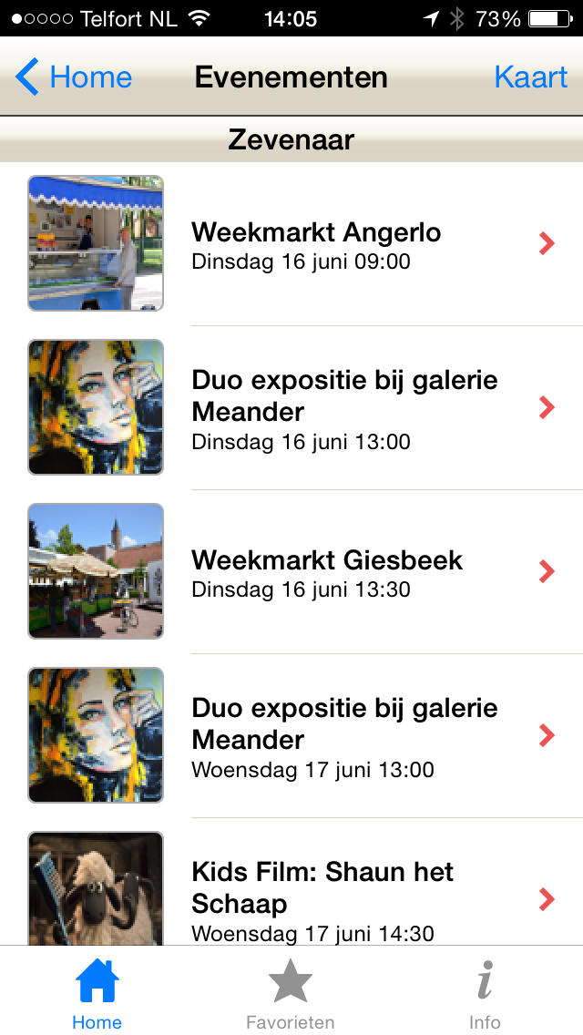 Aan de evenementenkalender in de Zevenaar app is onlangs een functionaliteit toegevoegd. Een evenement kan eenvoudig, via het kalendericoontje, in de eigen agenda worden opgenomen. De gebruiker krijgt dan daags tevoren, of op een ander ingesteld tijdstip, een seintje en er is automatisch meer informatie over het evenement opgenomen.