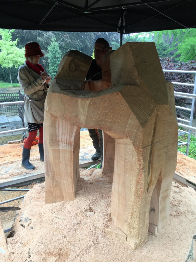 De firma TommyCarvingWoodwork is dinsdag begonnen met het opbouwen van de stellages rond de boom en later op de dag wordt gestart met het zagen.