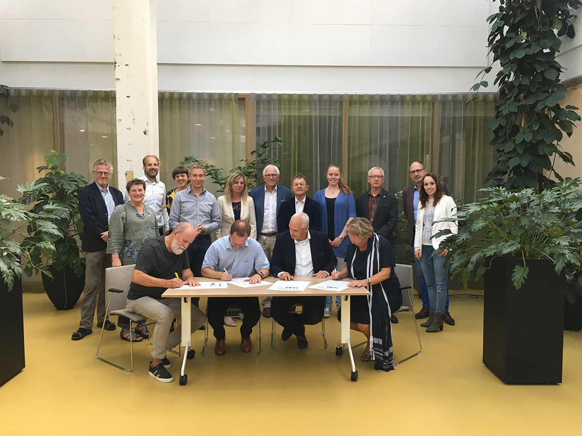 Foto: De partners ondertekenen de bevestiging van deelname, vlnr: Harri de Vries (Filmhuis Zevenaar), Bert Fröhlich (Kunstwerk!), Wethouder Nanne van Dellen (gemeente Zevenaar), Marlie Vennegoor (Caleidoz Welzijn).