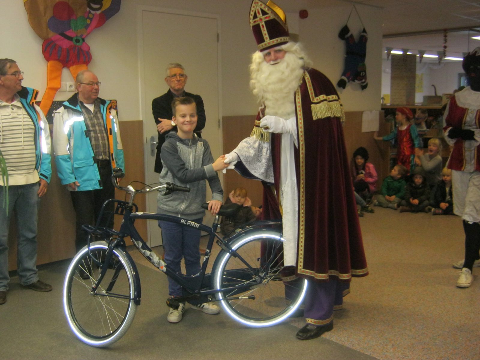 Fotobijschrift: Een van de winnaars ‘Ik wil je zien’-fietscampagne. Mees Hunting (in het midden met fiets) van de St. Franciscusschool ontvangt fiets uit handen van Sinterklaas en wethouder Gerard Hendriksen (rechts bovenaan) van de gemeente Zevenaar (foto van VVN).