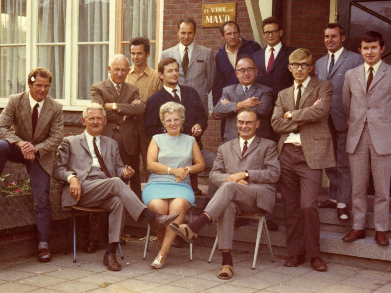 De docenten van de Mavo St. Martinus eind jaren zestig voor de school aan de Marsweg (huidige basisschool de Toorts) met onder andere Eggenhuizen, Roerink, Heijster, Harmsen, Schepper, Blom, Zegwaart en Jaspers. Foto archief OVD