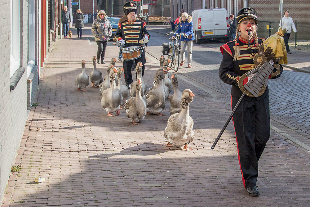 De ganzenfanfare trok begeleid door tromgeroffel de hele middag in optocht achter hun tambour-maître door Zevenaar. Een lust voor het oog.