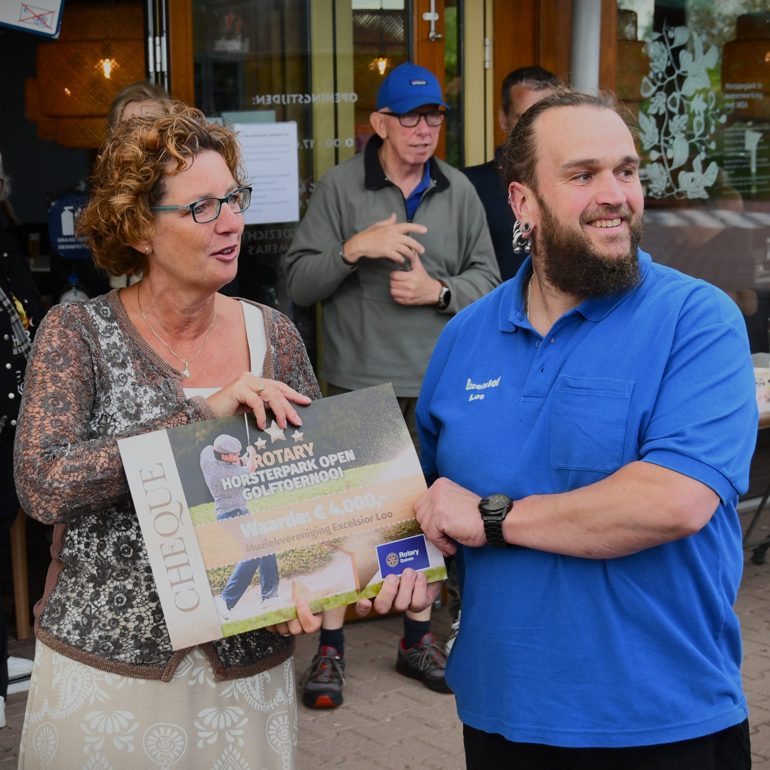 Het Horsterpark Open was weer een geweldig succes! Dankzij de deelname van spelers, donaties door sponsoren en de inzet van de vrijwilligers is een fantastisch bedrag opgehaald. Nicole Lieve -voorzitter Rotary Duiven- reikte een cheque van € 4.000,00 uit aan Theo van Schaik, voorzitter van muziekvereniging Excelsior .
